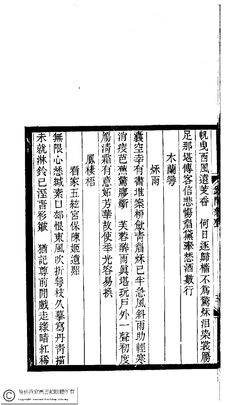 | (PRINT FRIENDLY VERSION) 小檀欒室彙刻閨秀詞﹕十集一百種一百卷(清徐乃昌輯) : 鏡閣新聲﹕一卷。清光緒二十二年(1896)南陵徐氏刻本。 ![]() Page : 鏡閣新聲.4a | click for larger image | 小檀欒室彙刻閨秀詞﹕十集一百種一百卷(清徐乃昌輯) : 鏡閣新聲﹕一卷。清光緒二十二年(1896)南陵徐氏刻本。![]() Page : 鏡閣新聲.3b | click for larger image | Back |