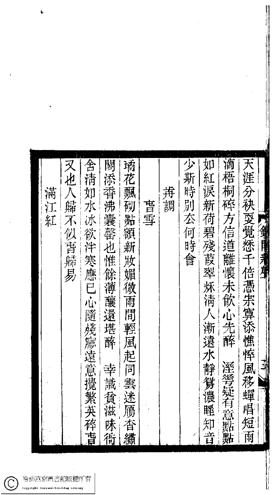 | (PRINT FRIENDLY VERSION) 小檀欒室彙刻閨秀詞﹕十集一百種一百卷(清徐乃昌輯) : 鏡閣新聲﹕一卷。清光緒二十二年(1896)南陵徐氏刻本。 ![]() Page : 鏡閣新聲.5b | click for larger image | 小檀欒室彙刻閨秀詞﹕十集一百種一百卷(清徐乃昌輯) : 鏡閣新聲﹕一卷。清光緒二十二年(1896)南陵徐氏刻本。![]() Page : 鏡閣新聲.5a | click for larger image | Back |