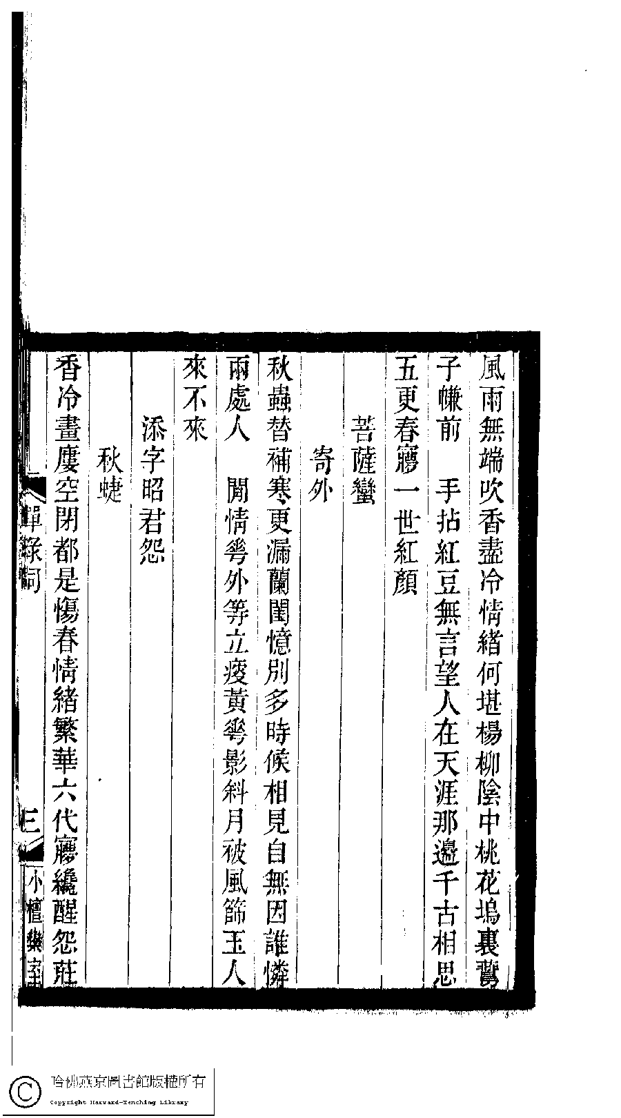 | (PRINT FRIENDLY VERSION) 小檀欒室彙刻閨秀詞﹕十集一百種一百卷(清徐乃昌輯) : 彈綠詞﹕一卷。清光緒二十二年(1896)南陵徐氏刻本。 ![]() Page : 彈綠詞.3a | click for larger image | 小檀欒室彙刻閨秀詞﹕十集一百種一百卷(清徐乃昌輯) : 彈綠詞﹕一卷。清光緒二十二年(1896)南陵徐氏刻本。![]() Page : 彈綠詞.2b | click for larger image | Back |
