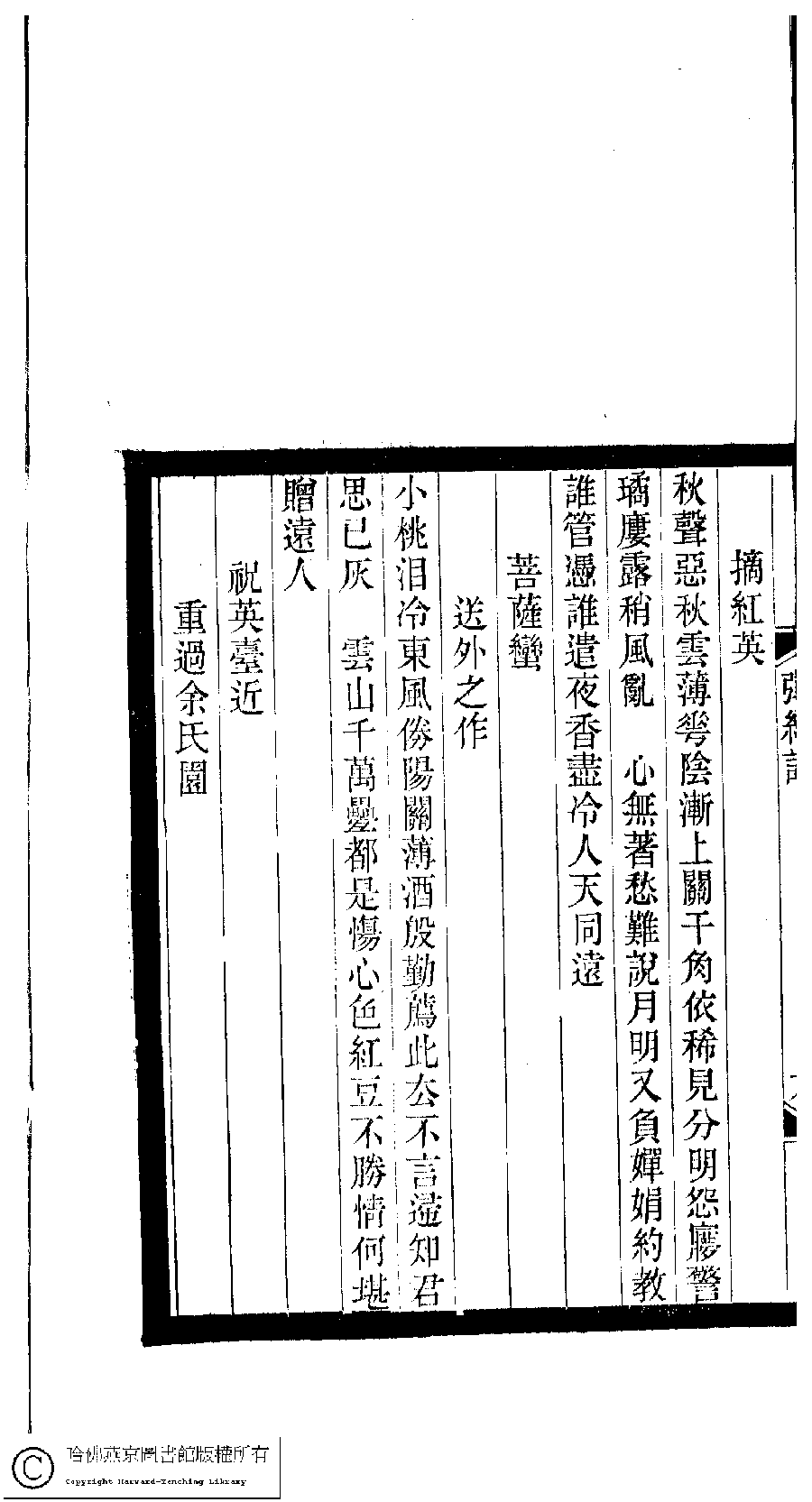 | (PRINT FRIENDLY VERSION) 小檀欒室彙刻閨秀詞﹕十集一百種一百卷(清徐乃昌輯) : 彈綠詞﹕一卷。清光緒二十二年(1896)南陵徐氏刻本。 ![]() Page : 彈綠詞.6b | click for larger image | Back |