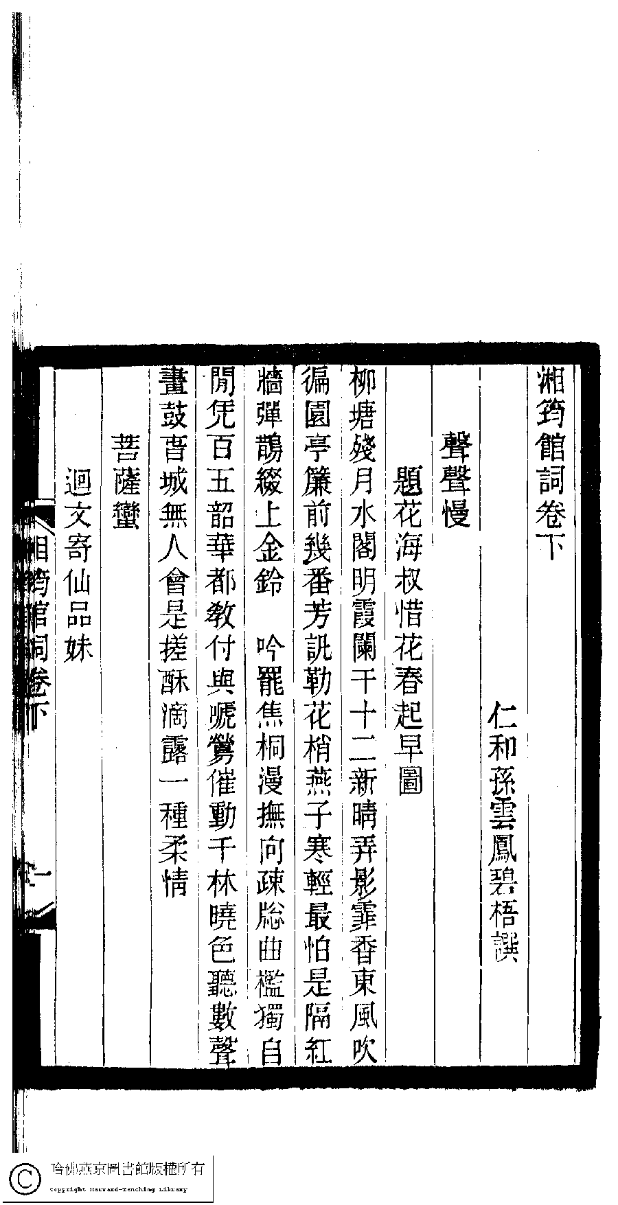 | (PRINT FRIENDLY VERSION) 小檀欒室彙刻閨秀詞﹕十集一百種一百卷(清徐乃昌輯) : 湘雲館詞﹕二卷。清光緒二十二年(1896)南陵徐氏刻本。 ![]() Page : 卷下.1a | click for larger image | Back |