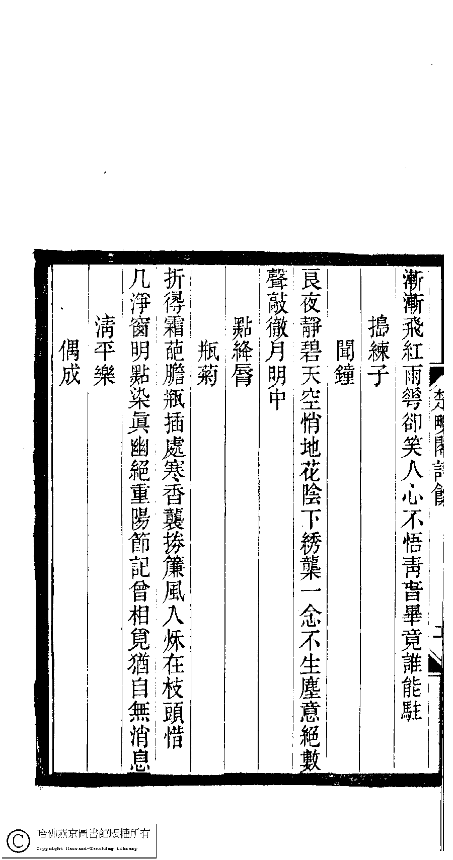 | Appears in: Xiao tan luan shi hui ke gui xiu ci: 10 ji 100 zhong 100 juan (edited by Xu Naichang, Qing dynasty): Chu wan ge shi yu: 1 juan |