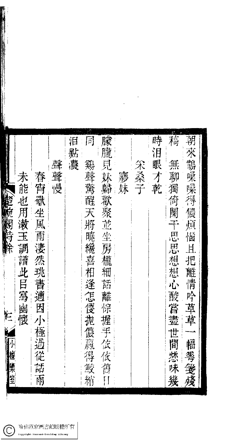 | (PRINT FRIENDLY VERSION) 小檀欒室彙刻閨秀詞﹕十集一百種一百卷(清徐乃昌輯) : 楚畹閣詩餘﹕一卷。清光緒二十二年(1896)南陵徐氏刻本。 ![]() Page : 楚畹閣詩餘.3a | click for larger image | 小檀欒室彙刻閨秀詞﹕十集一百種一百卷(清徐乃昌輯) : 楚畹閣詩餘﹕一卷。清光緒二十二年(1896)南陵徐氏刻本。![]() Page : 楚畹閣詩餘.2b | click for larger image | Back |