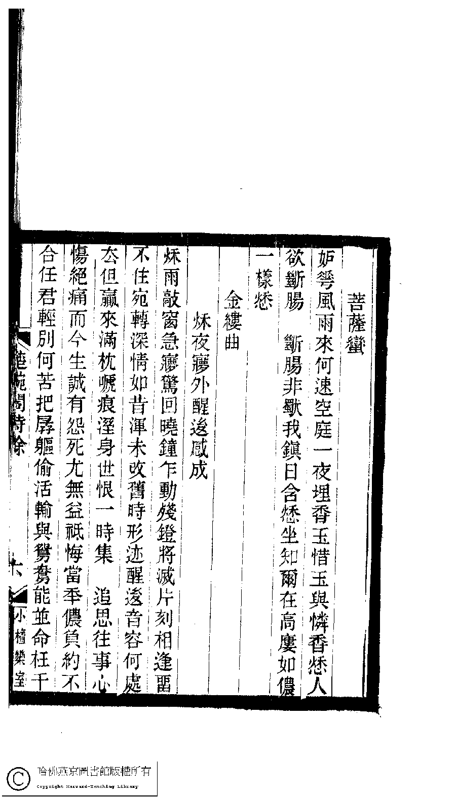 | (PRINT FRIENDLY VERSION) 小檀欒室彙刻閨秀詞﹕十集一百種一百卷(清徐乃昌輯) : 楚畹閣詩餘﹕一卷。清光緒二十二年(1896)南陵徐氏刻本。 ![]() Page : 楚畹閣詩餘.6b | click for larger image | 小檀欒室彙刻閨秀詞﹕十集一百種一百卷(清徐乃昌輯) : 楚畹閣詩餘﹕一卷。清光緒二十二年(1896)南陵徐氏刻本。![]() Page : 楚畹閣詩餘.6a | click for larger image | Back |