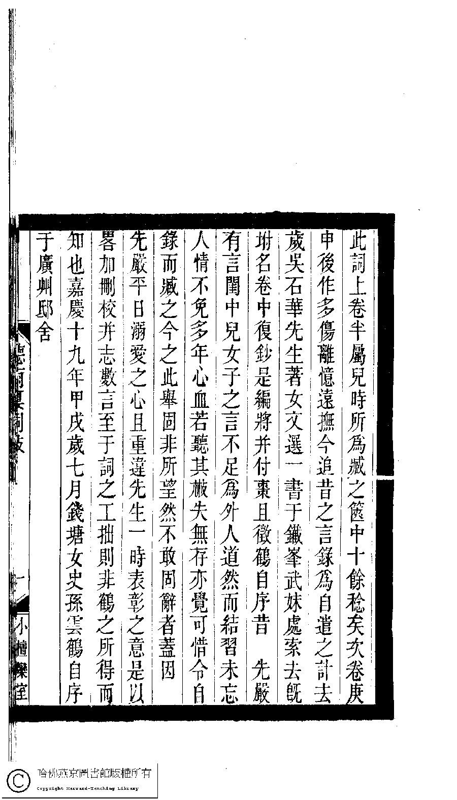 | (PRINT FRIENDLY VERSION) 小檀欒室彙刻閨秀詞﹕十集一百種一百卷(清徐乃昌輯) : 聽雨樓詞﹕二卷。清光緒二十二年(1896)南陵徐氏刻本。 ![]() Page : 聽雨樓詞.序.1b | click for larger image | 小檀欒室彙刻閨秀詞﹕十集一百種一百卷(清徐乃昌輯) : 聽雨樓詞﹕二卷。清光緒二十二年(1896)南陵徐氏刻本。![]() Page : 聽雨樓詞.序.1a | click for larger image | Back |