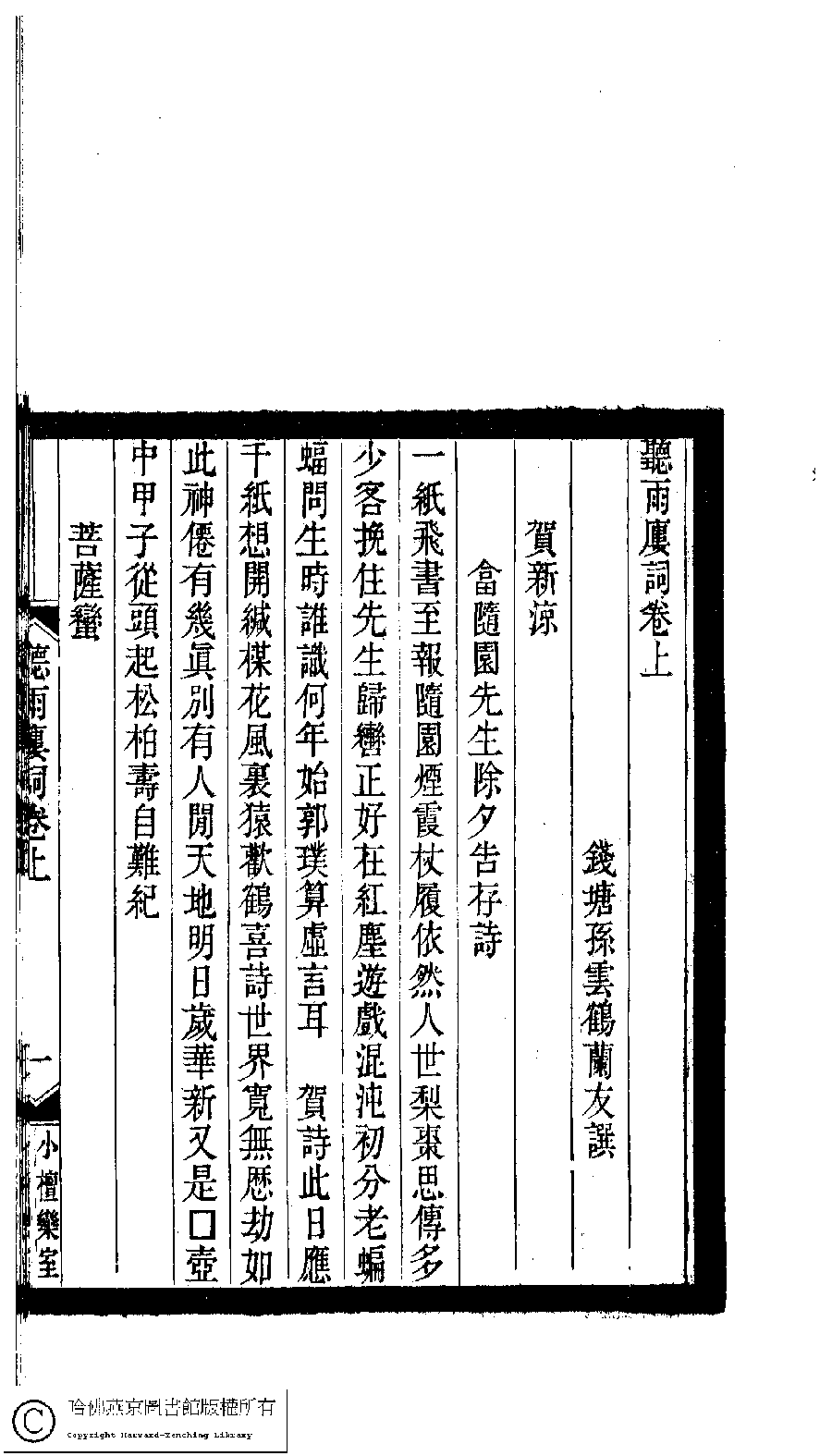 | (PRINT FRIENDLY VERSION) 小檀欒室彙刻閨秀詞﹕十集一百種一百卷(清徐乃昌輯) : 聽雨樓詞﹕二卷。清光緒二十二年(1896)南陵徐氏刻本。 ![]() Page : 聽雨樓詞.上.1b | click for larger image | 小檀欒室彙刻閨秀詞﹕十集一百種一百卷(清徐乃昌輯) : 聽雨樓詞﹕二卷。清光緒二十二年(1896)南陵徐氏刻本。![]() Page : 聽雨樓詞.上.1a | click for larger image | Back |