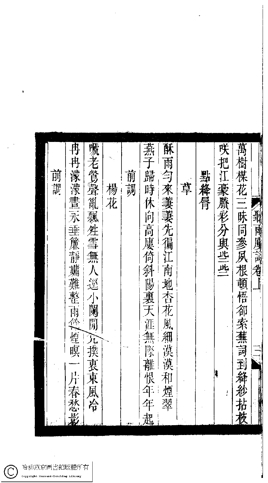 | (PRINT FRIENDLY VERSION) 小檀欒室彙刻閨秀詞﹕十集一百種一百卷(清徐乃昌輯) : 聽雨樓詞﹕二卷。清光緒二十二年(1896)南陵徐氏刻本。 ![]() Page : 聽雨樓詞.上.3b | click for larger image | Back |
