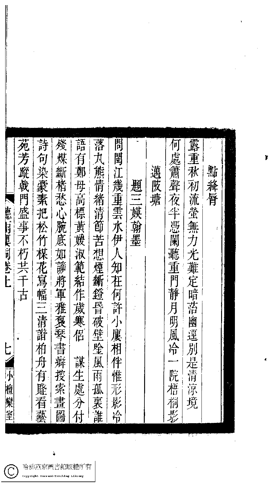 | (PRINT FRIENDLY VERSION) 小檀欒室彙刻閨秀詞﹕十集一百種一百卷(清徐乃昌輯) : 聽雨樓詞﹕二卷。清光緒二十二年(1896)南陵徐氏刻本。 ![]() Page : 聽雨樓詞.上.7a | click for larger image | Back |
