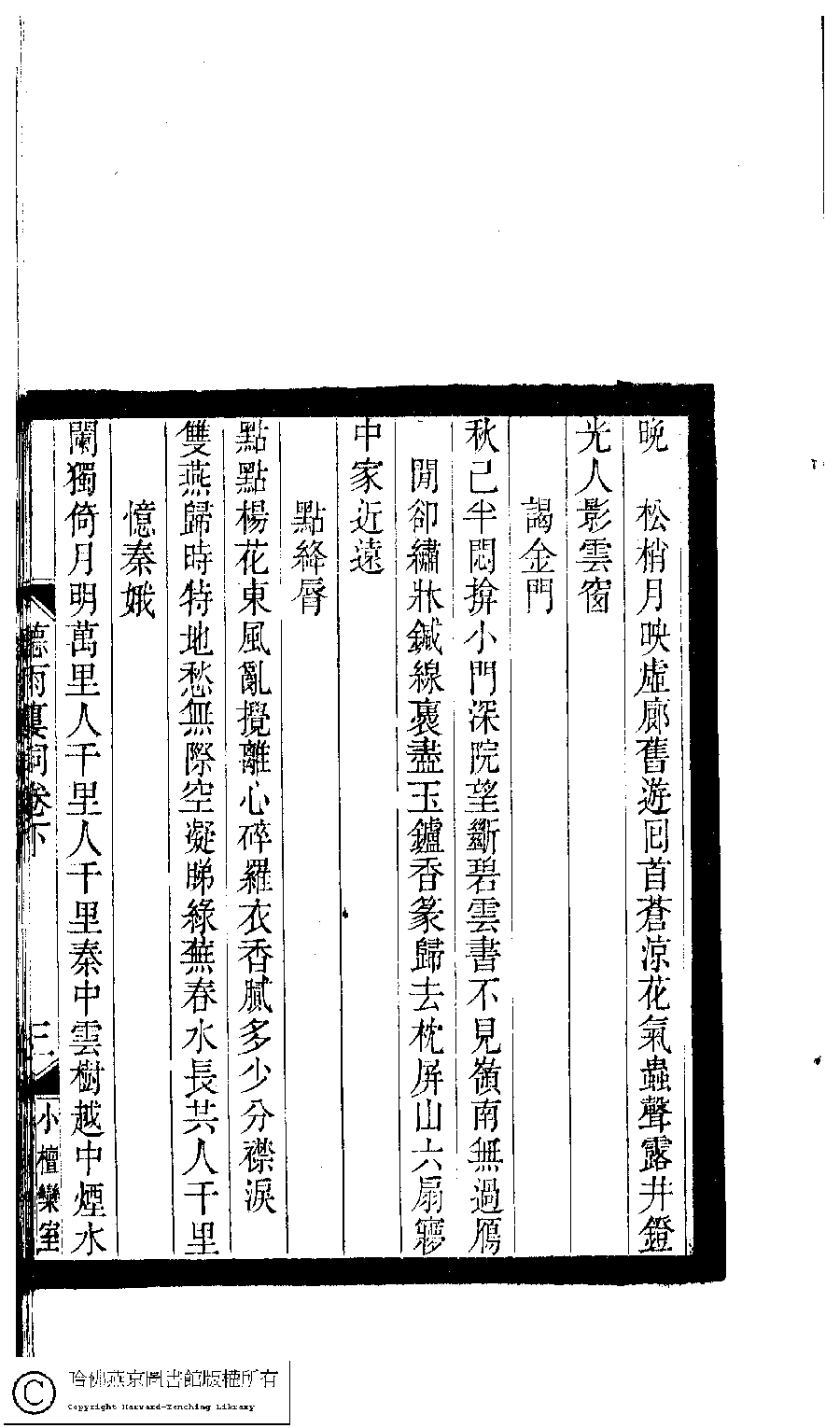 | (PRINT FRIENDLY VERSION) 小檀欒室彙刻閨秀詞﹕十集一百種一百卷(清徐乃昌輯) : 聽雨樓詞﹕二卷。清光緒二十二年(1896)南陵徐氏刻本。 ![]() Page : 聽雨樓詞.下.3a | click for larger image | Back |