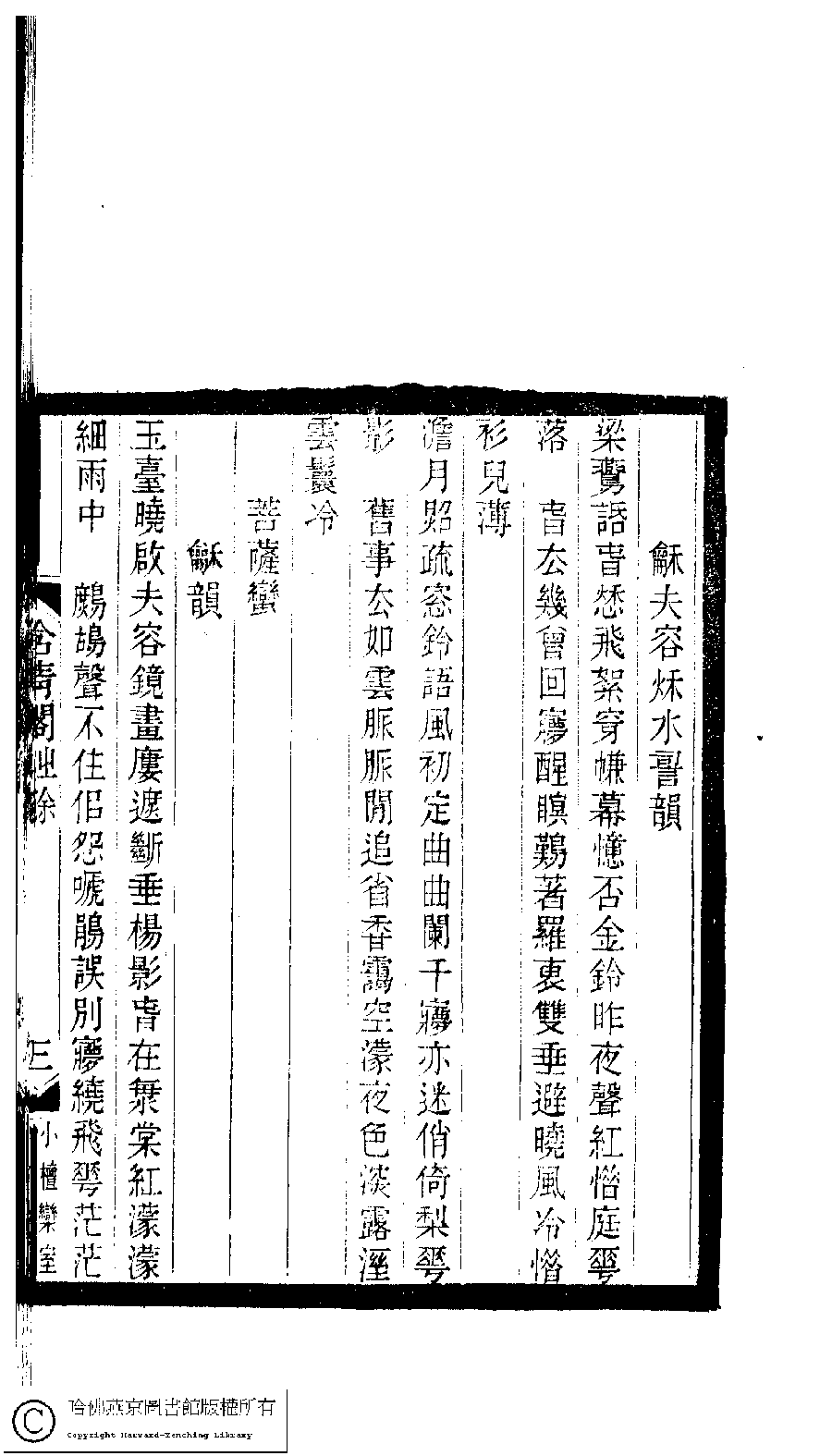 | (PRINT FRIENDLY VERSION) 小檀欒室彙刻閨秀詞﹕十集一百種一百卷(清徐乃昌輯) : 含青閣詩餘﹕一卷。清光緒二十二年(1896)南陵徐氏刻本。 ![]() Page : 含青閣詩餘.3b | click for larger image | 小檀欒室彙刻閨秀詞﹕十集一百種一百卷(清徐乃昌輯) : 含青閣詩餘﹕一卷。清光緒二十二年(1896)南陵徐氏刻本。![]() Page : 含青閣詩餘.3a | click for larger image | Back |