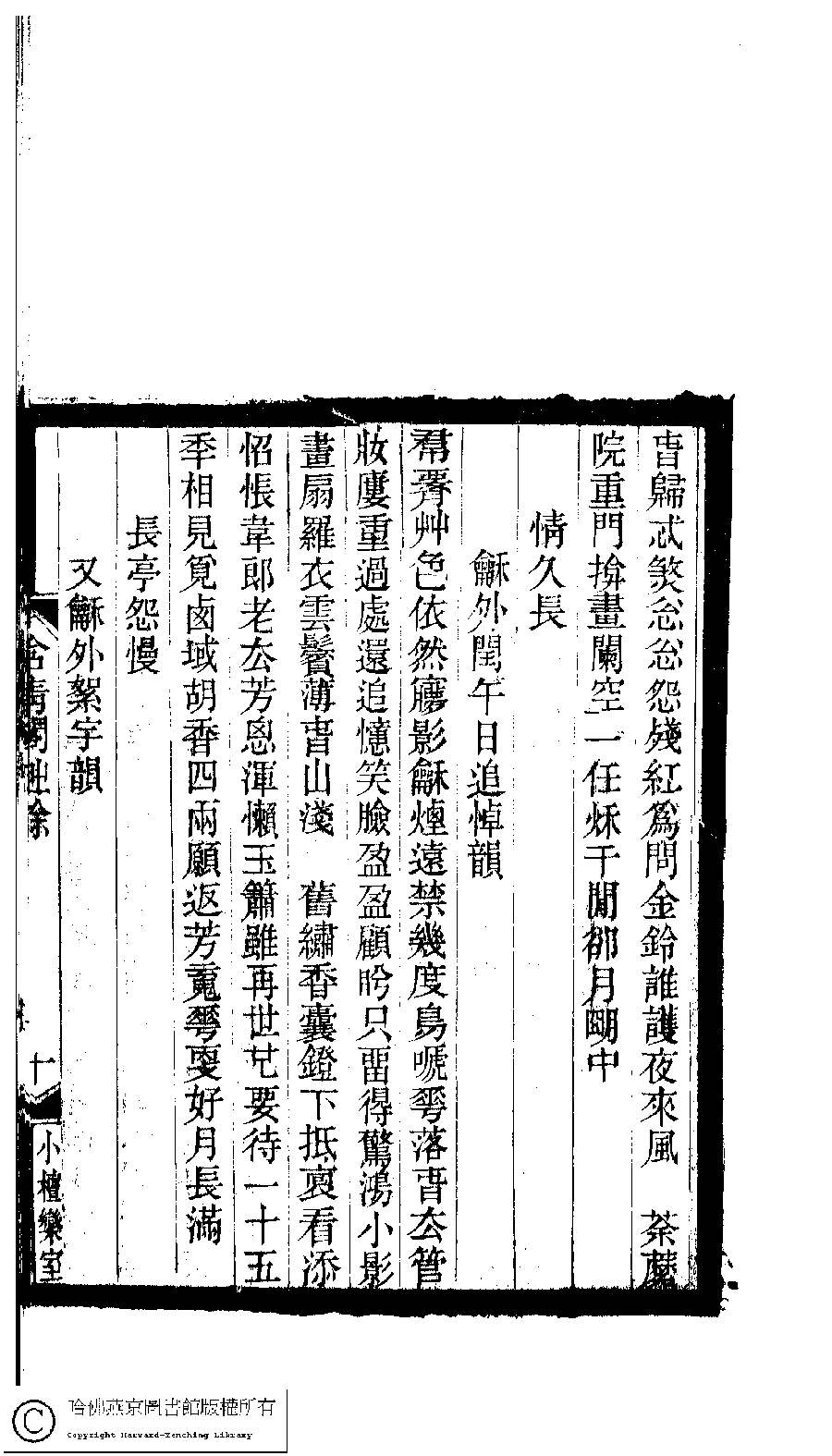 | (PRINT FRIENDLY VERSION) 小檀欒室彙刻閨秀詞﹕十集一百種一百卷(清徐乃昌輯) : 含青閣詩餘﹕一卷。清光緒二十二年(1896)南陵徐氏刻本。 ![]() Page : 含青閣詩餘.10b | click for larger image | 小檀欒室彙刻閨秀詞﹕十集一百種一百卷(清徐乃昌輯) : 含青閣詩餘﹕一卷。清光緒二十二年(1896)南陵徐氏刻本。![]() Page : 含青閣詩餘.10a | click for larger image | Back |