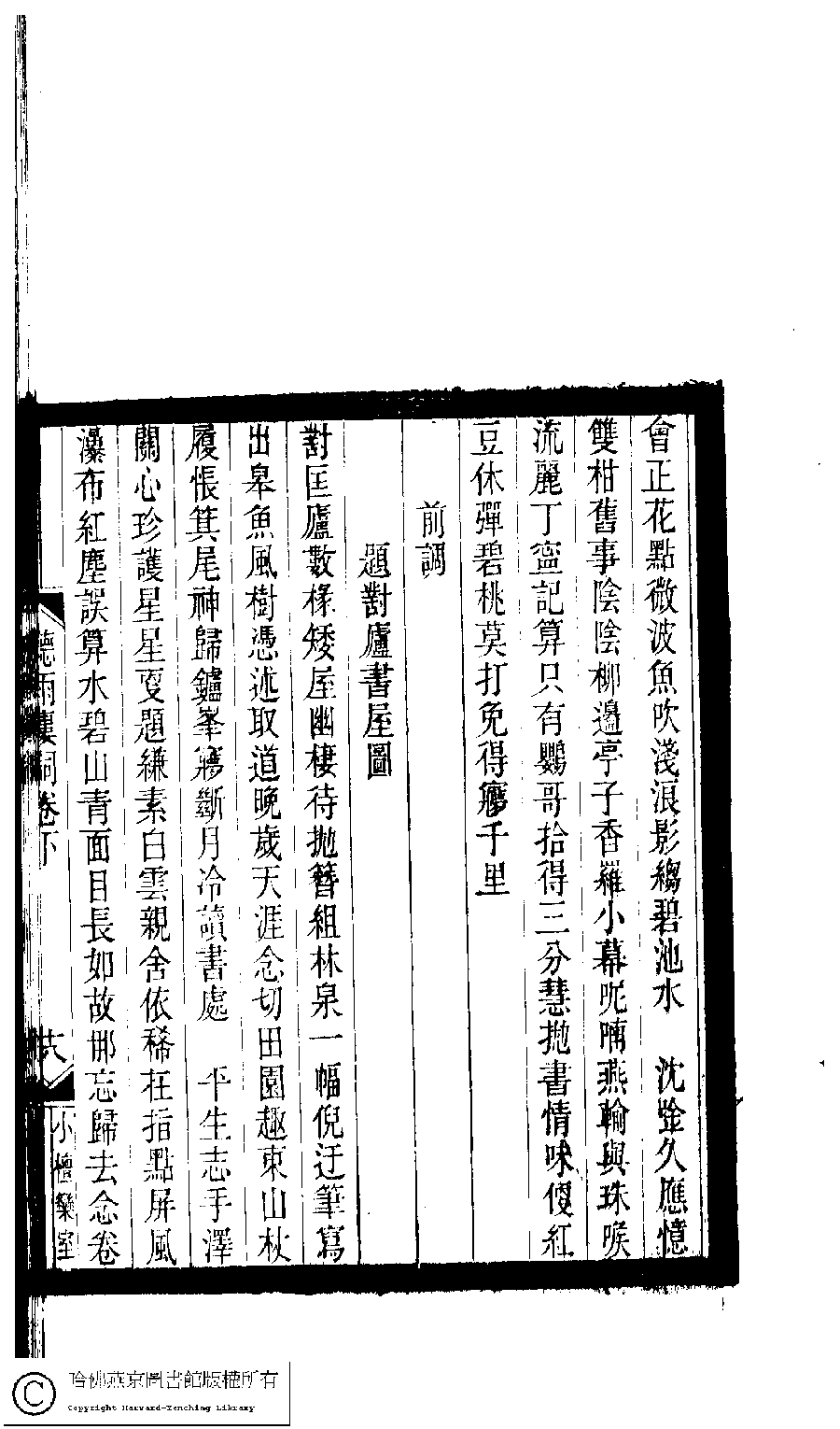 | (PRINT FRIENDLY VERSION) 小檀欒室彙刻閨秀詞﹕十集一百種一百卷(清徐乃昌輯) : 聽雨樓詞﹕二卷。清光緒二十二年(1896)南陵徐氏刻本。 ![]() Page : 聽雨樓詞.下.18a | click for larger image | 小檀欒室彙刻閨秀詞﹕十集一百種一百卷(清徐乃昌輯) : 聽雨樓詞﹕二卷。清光緒二十二年(1896)南陵徐氏刻本。![]() Page : 聽雨樓詞.下.17b | click for larger image | Back |