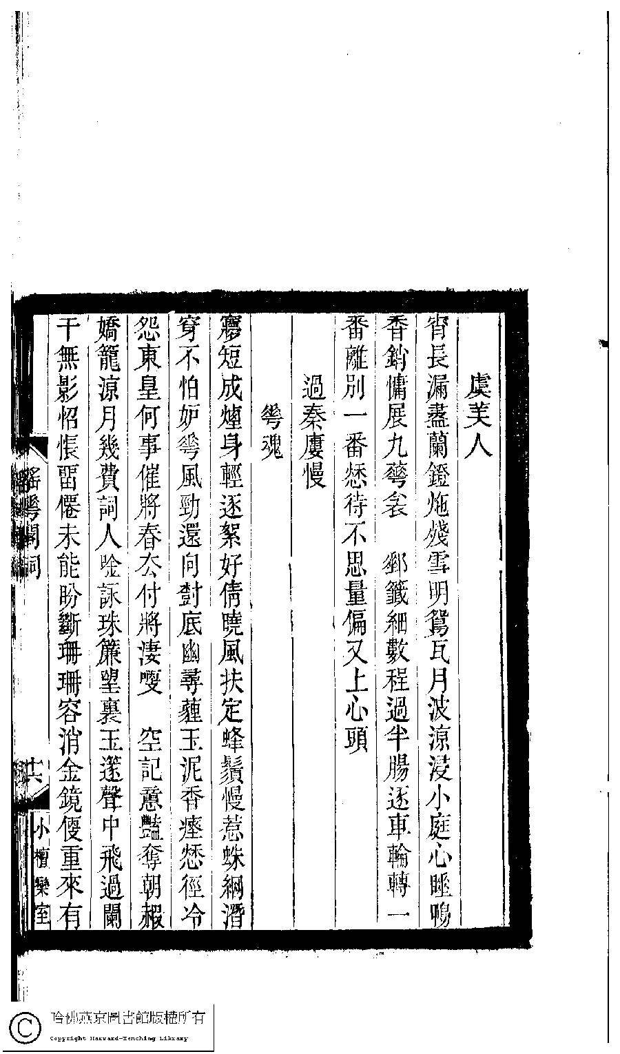 | Appears in: Xiao tan luan shi hui ke gui xiu ci: 10 ji 100 zhong 100 juan (edited by Xu Naichang, Qing dynasty): Yao hua ge ci: 1 juan, Bu yi: 1 juan |
