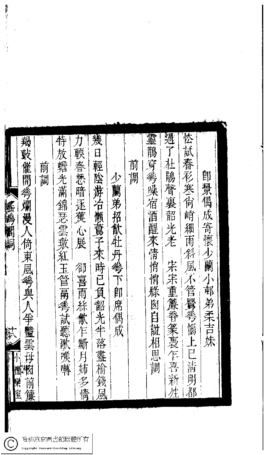 | Appears in: Xiao tan luan shi hui ke gui xiu ci: 10 ji 100 zhong 100 juan (edited by Xu Naichang, Qing dynasty): Yao hua ge ci: 1 juan, Bu yi: 1 juan |