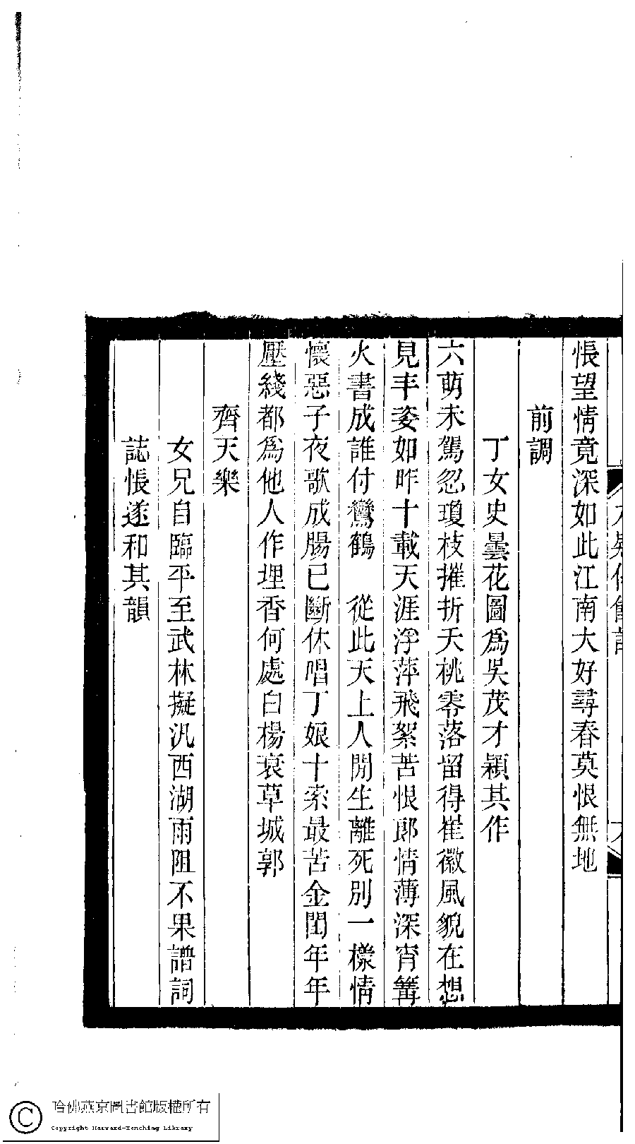 | (PRINT FRIENDLY VERSION) 小檀欒室彙刻閨秀詞﹕十集一百種一百卷(清徐乃昌輯) : 九疑仙館詞﹕一卷。清光緒二十二年(1896)南陵徐氏刻本。 ![]() Page : 九疑仙館詞.6b | click for larger image | 小檀欒室彙刻閨秀詞﹕十集一百種一百卷(清徐乃昌輯) : 九疑仙館詞﹕一卷。清光緒二十二年(1896)南陵徐氏刻本。![]() Page : 九疑仙館詞.6a | click for larger image | Back |