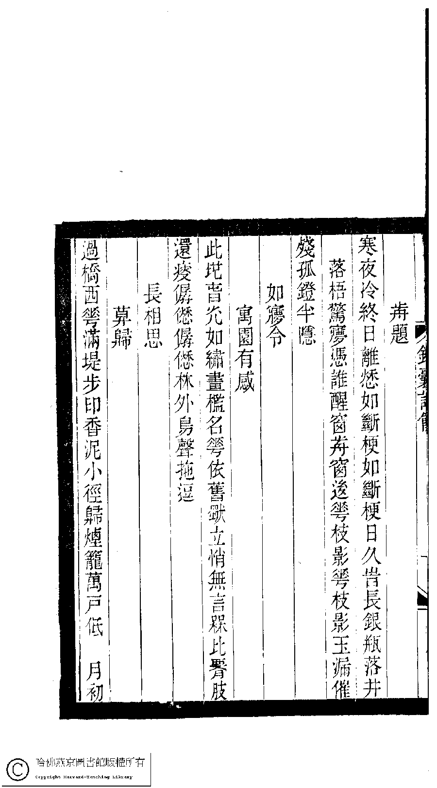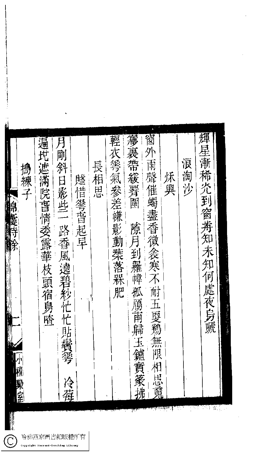 | (PRINT FRIENDLY VERSION) 小檀欒室彙刻閨秀詞﹕十集一百種一百卷(清徐乃昌輯) : 錦囊詩餘﹕一卷。清光緒二十二年(1896)南陵徐氏刻本。 ![]() Page : 錦囊詩餘.2a | click for larger image | 小檀欒室彙刻閨秀詞﹕十集一百種一百卷(清徐乃昌輯) : 錦囊詩餘﹕一卷。清光緒二十二年(1896)南陵徐氏刻本。![]() Page : 錦囊詩餘.1b | click for larger image | Back |