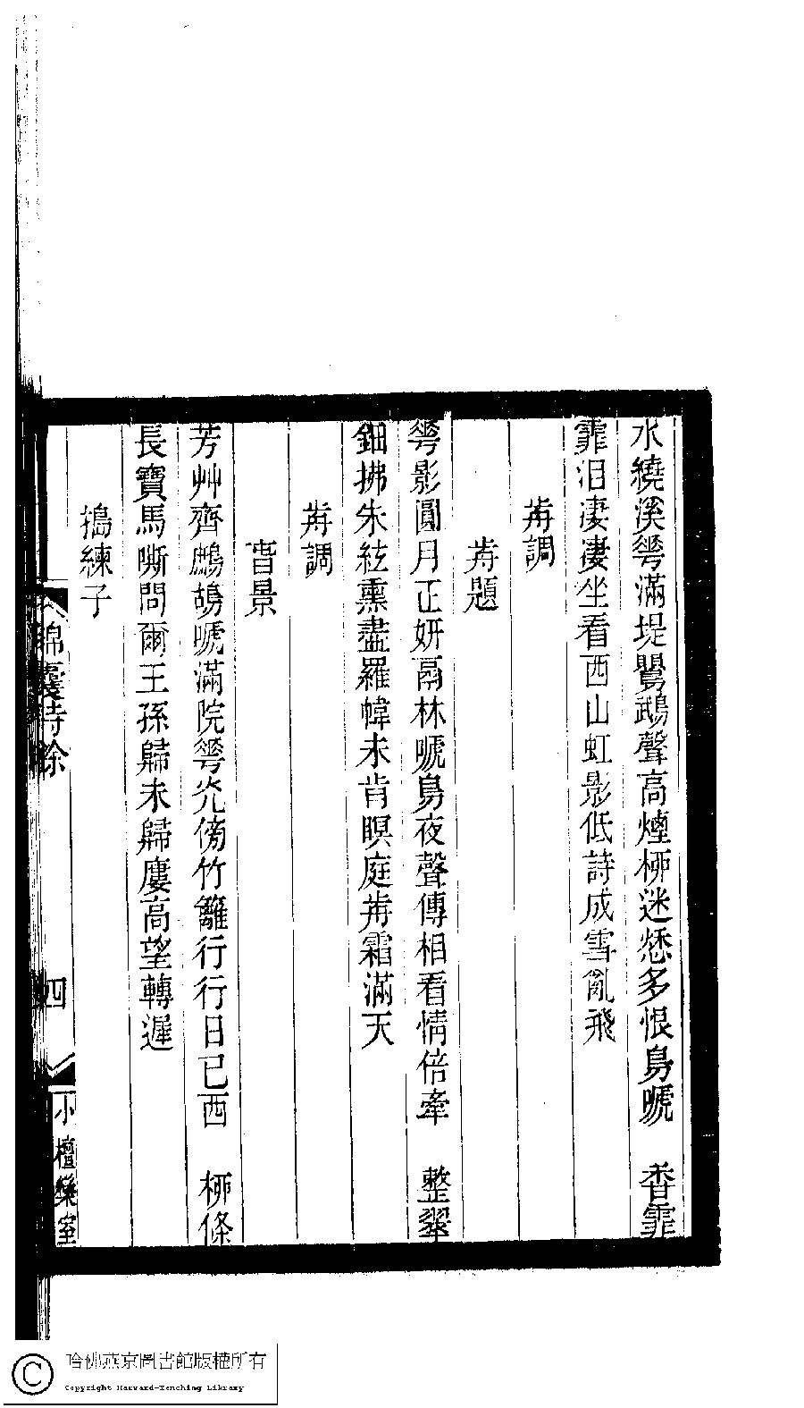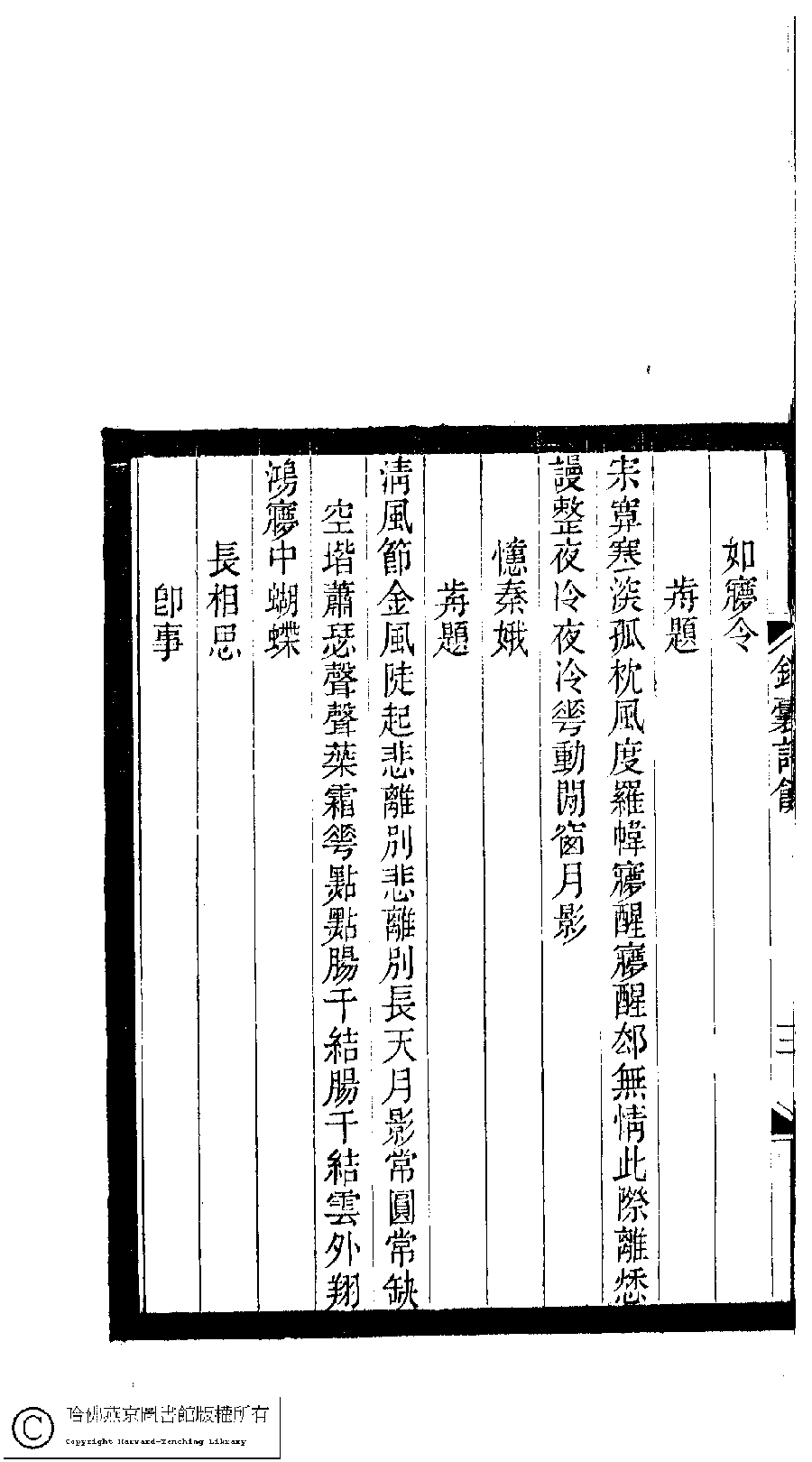 | (PRINT FRIENDLY VERSION) 小檀欒室彙刻閨秀詞﹕十集一百種一百卷(清徐乃昌輯) : 錦囊詩餘﹕一卷。清光緒二十二年(1896)南陵徐氏刻本。 ![]() Page : 錦囊詩餘.4a | click for larger image | 小檀欒室彙刻閨秀詞﹕十集一百種一百卷(清徐乃昌輯) : 錦囊詩餘﹕一卷。清光緒二十二年(1896)南陵徐氏刻本。![]() Page : 錦囊詩餘.3b | click for larger image | Back |