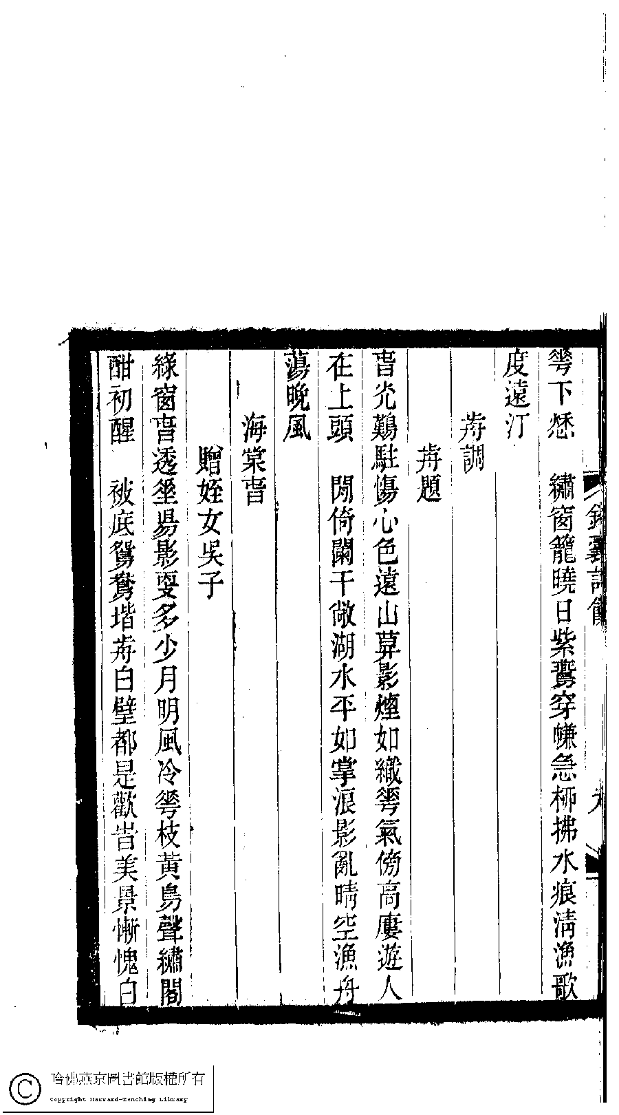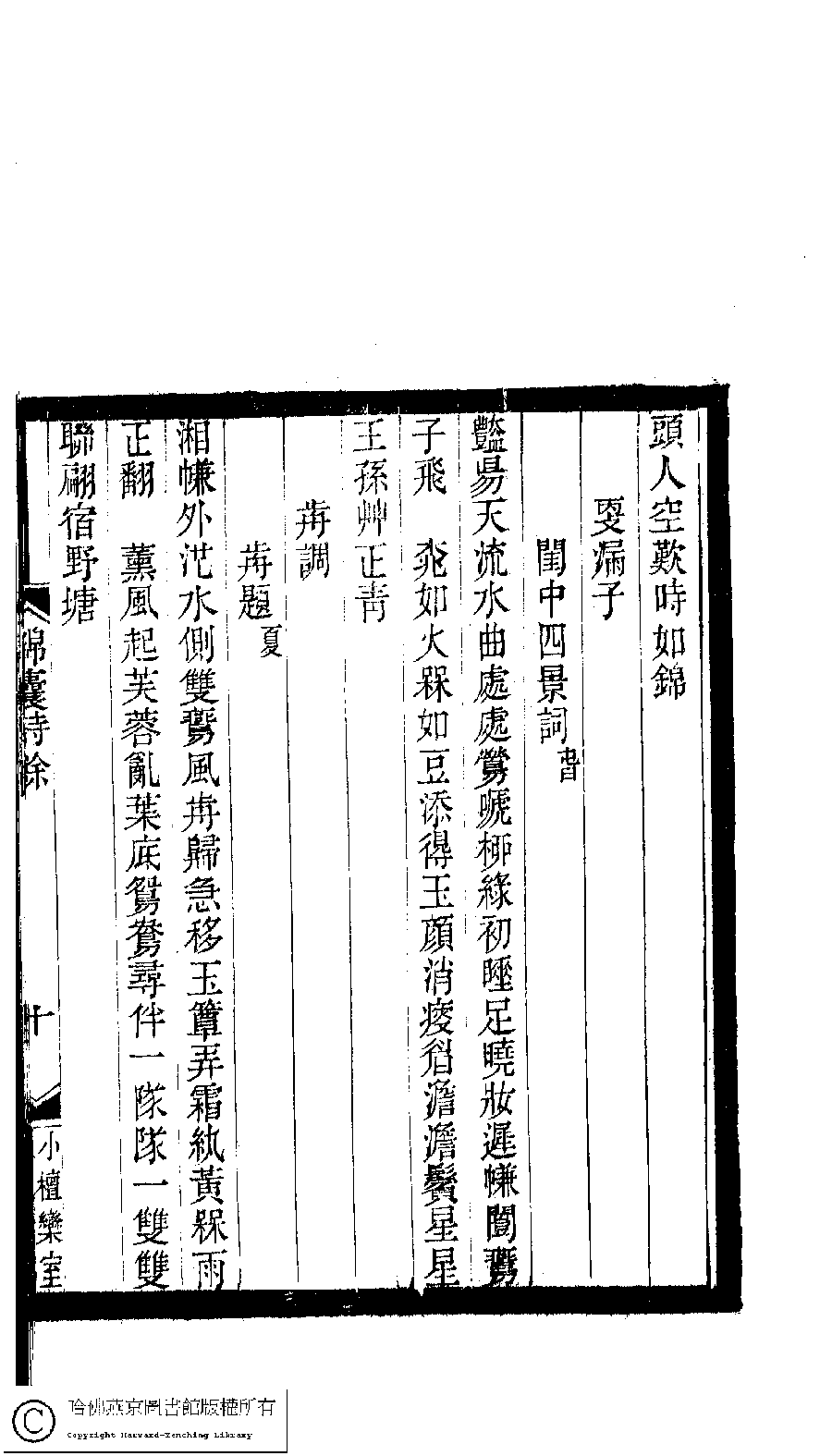 | (PRINT FRIENDLY VERSION) 小檀欒室彙刻閨秀詞﹕十集一百種一百卷(清徐乃昌輯) : 錦囊詩餘﹕一卷。清光緒二十二年(1896)南陵徐氏刻本。 ![]() Page : 錦囊詩餘.10a | click for larger image | 小檀欒室彙刻閨秀詞﹕十集一百種一百卷(清徐乃昌輯) : 錦囊詩餘﹕一卷。清光緒二十二年(1896)南陵徐氏刻本。![]() Page : 錦囊詩餘.9b | click for larger image | Back |