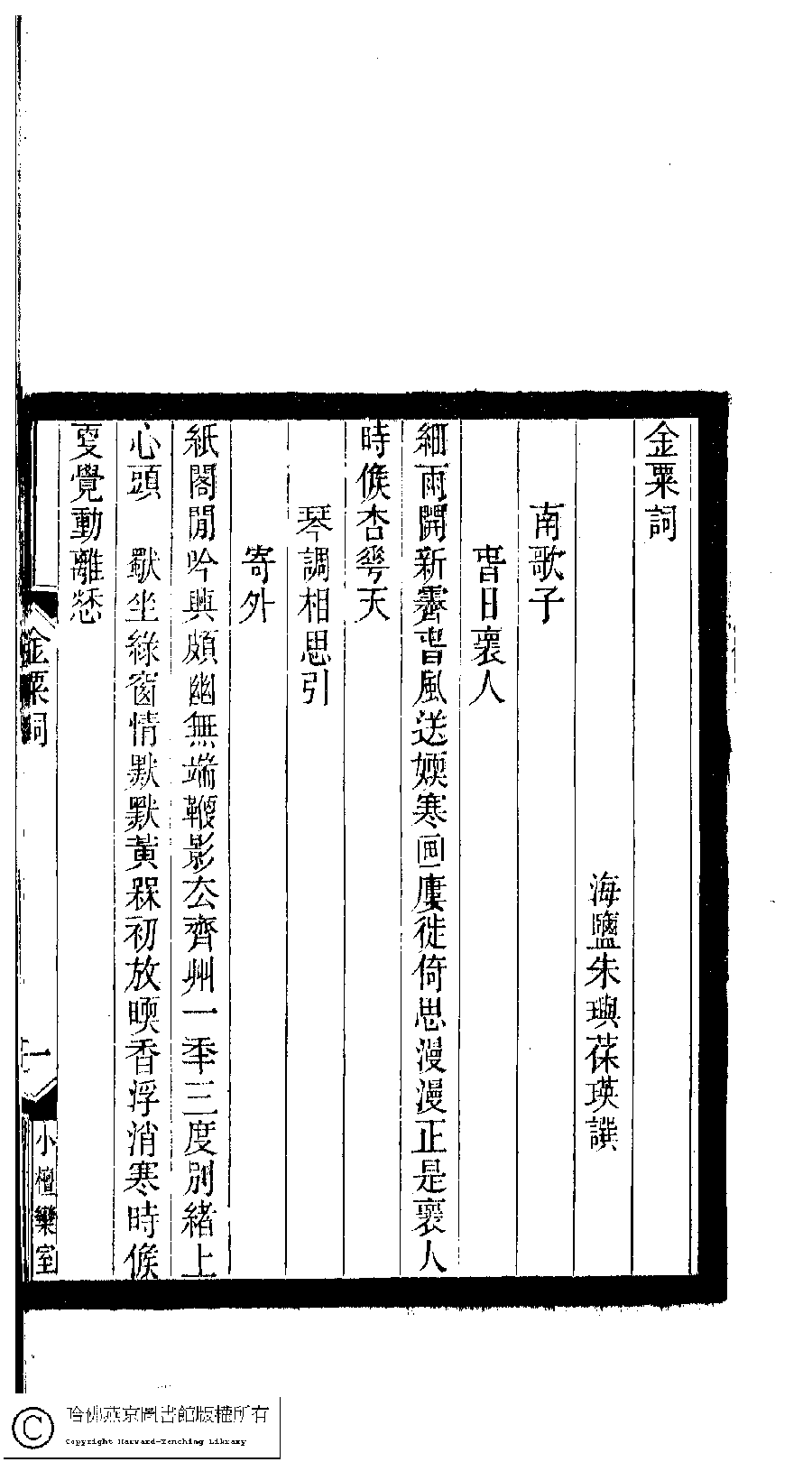 | (PRINT FRIENDLY VERSION) 小檀欒室彙刻閨秀詞﹕十集一百種一百卷(清徐乃昌輯) : 金粟詞﹕一卷。清光緒二十二年(1896)南陵徐氏刻本。 ![]() Page : 金粟詞.1a | click for larger image | Back |