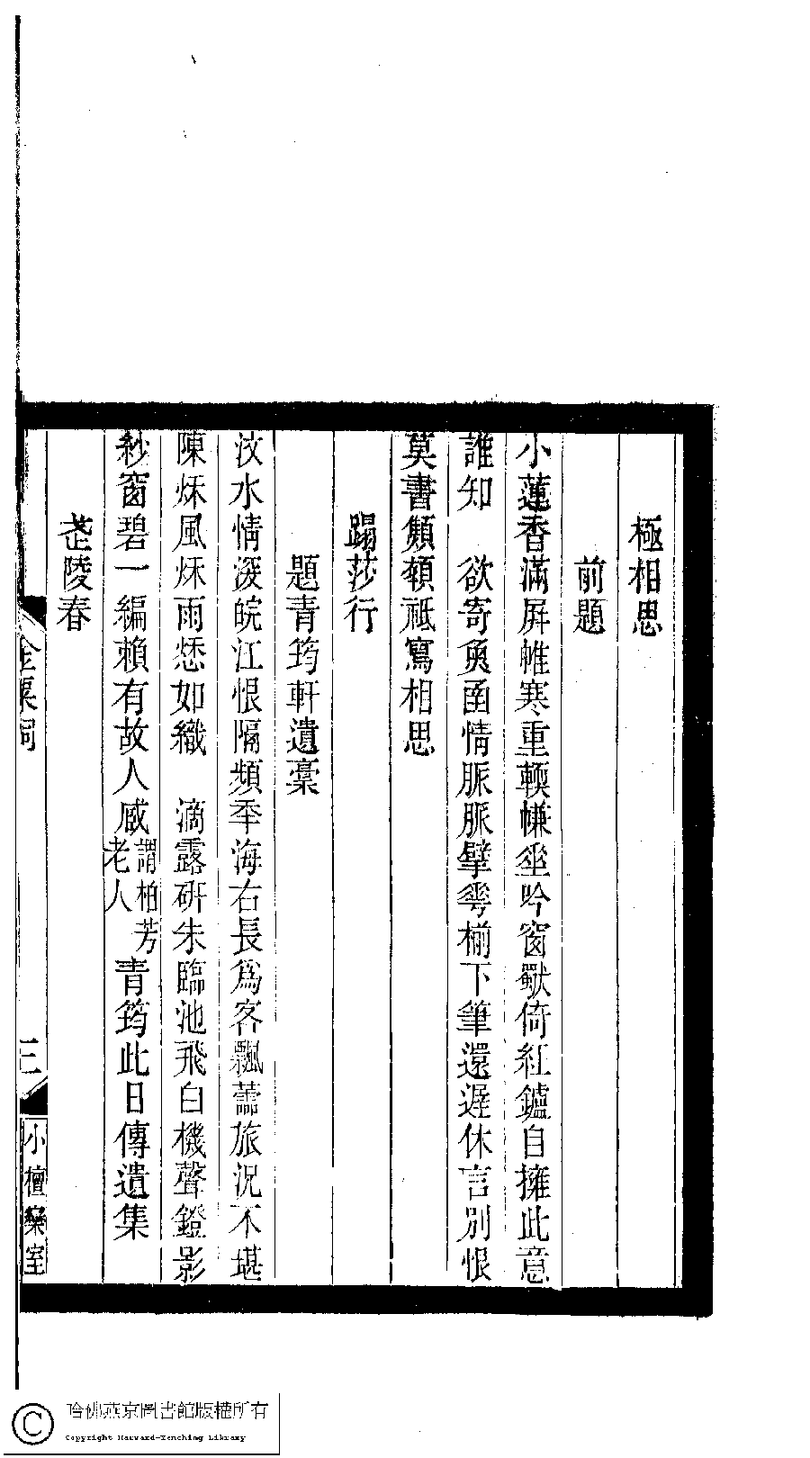 | (PRINT FRIENDLY VERSION) 小檀欒室彙刻閨秀詞﹕十集一百種一百卷(清徐乃昌輯) : 金粟詞﹕一卷。清光緒二十二年(1896)南陵徐氏刻本。 ![]() Page : 金粟詞.3b | click for larger image | 小檀欒室彙刻閨秀詞﹕十集一百種一百卷(清徐乃昌輯) : 金粟詞﹕一卷。清光緒二十二年(1896)南陵徐氏刻本。![]() Page : 金粟詞.3a | click for larger image | Back |
