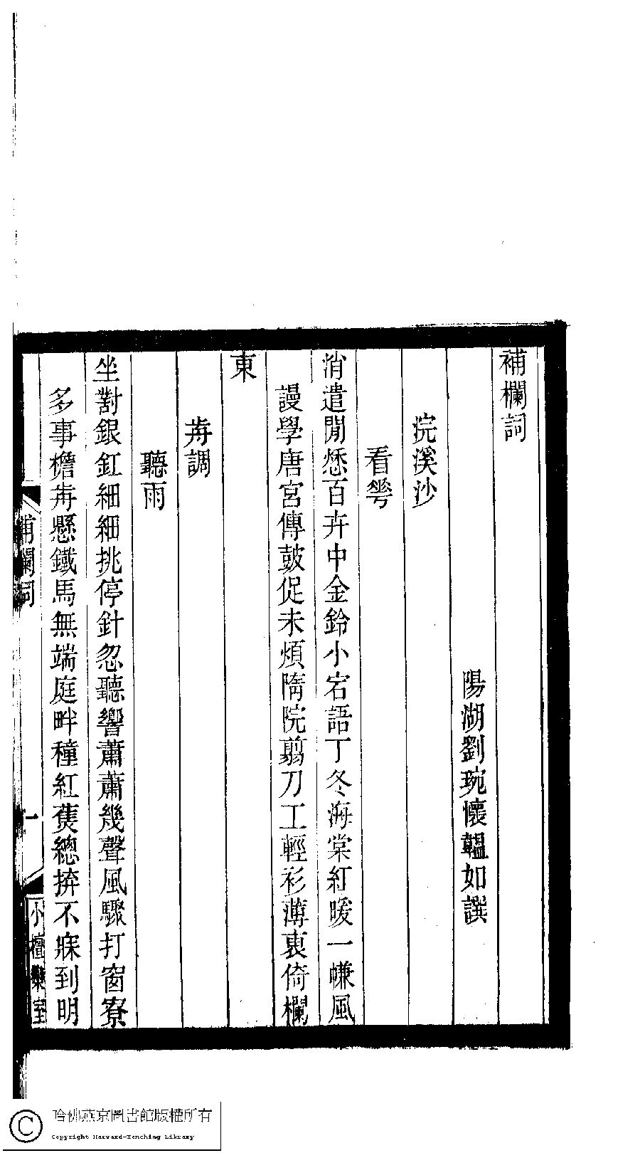 | (PRINT FRIENDLY VERSION) 小檀欒室彙刻閨秀詞﹕十集一百種一百卷(清徐乃昌輯) : 補欄詞﹕一卷。清光緒二十二年(1896)南陵徐氏刻本。 ![]() Page : 補欄詞.1a | click for larger image | Back |