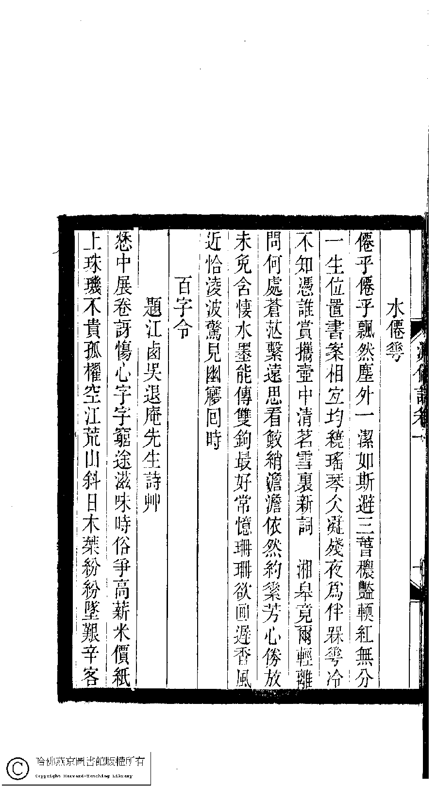 | (PRINT FRIENDLY VERSION) 小檀欒室彙刻閨秀詞﹕十集一百種一百卷(清徐乃昌輯) : 澹僊詞﹕四卷。清光緒二十二年(1896)南陵徐氏刻本。 ![]() Page : 澹僊詞.卷1.10b | click for larger image | 小檀欒室彙刻閨秀詞﹕十集一百種一百卷(清徐乃昌輯) : 澹僊詞﹕四卷。清光緒二十二年(1896)南陵徐氏刻本。![]() Page : 澹僊詞.卷1.10a | click for larger image | Back |