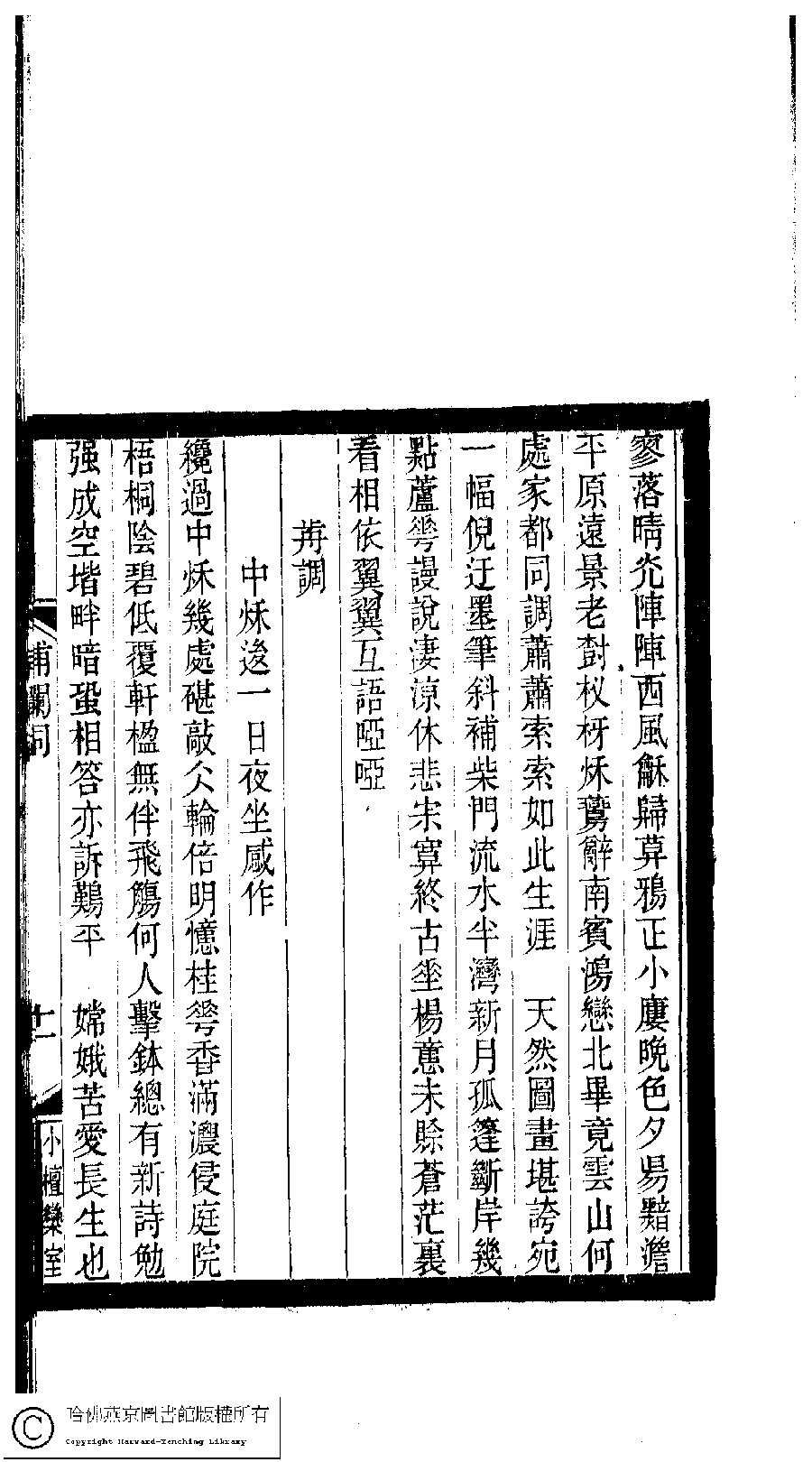 | (PRINT FRIENDLY VERSION) 小檀欒室彙刻閨秀詞﹕十集一百種一百卷(清徐乃昌輯) : 補欄詞﹕一卷。清光緒二十二年(1896)南陵徐氏刻本。 ![]() Page : 補欄詞.11a | click for larger image | 小檀欒室彙刻閨秀詞﹕十集一百種一百卷(清徐乃昌輯) : 補欄詞﹕一卷。清光緒二十二年(1896)南陵徐氏刻本。![]() Page : 補欄詞.10b | click for larger image | Back |