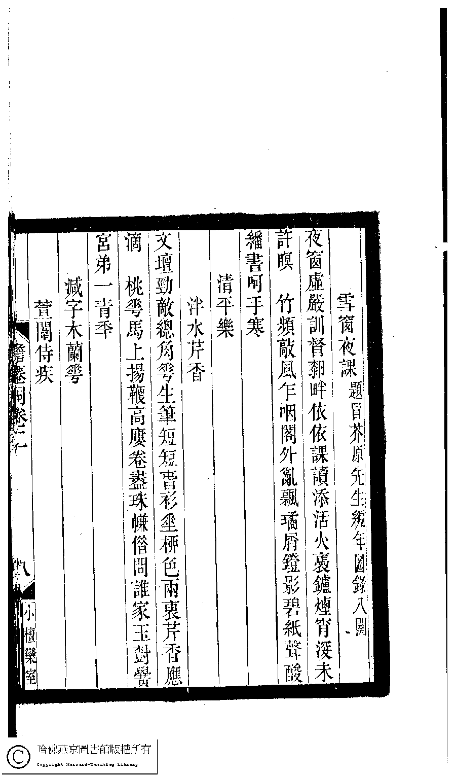| (PRINT FRIENDLY VERSION) 小檀欒室彙刻閨秀詞﹕十集一百種一百卷(清徐乃昌輯) : 澹僊詞﹕四卷。清光緒二十二年(1896)南陵徐氏刻本。 ![]() Page : 澹僊詞.卷2.8b | click for larger image | 小檀欒室彙刻閨秀詞﹕十集一百種一百卷(清徐乃昌輯) : 澹僊詞﹕四卷。清光緒二十二年(1896)南陵徐氏刻本。![]() Page : 澹僊詞.卷2.8a | click for larger image | Back |