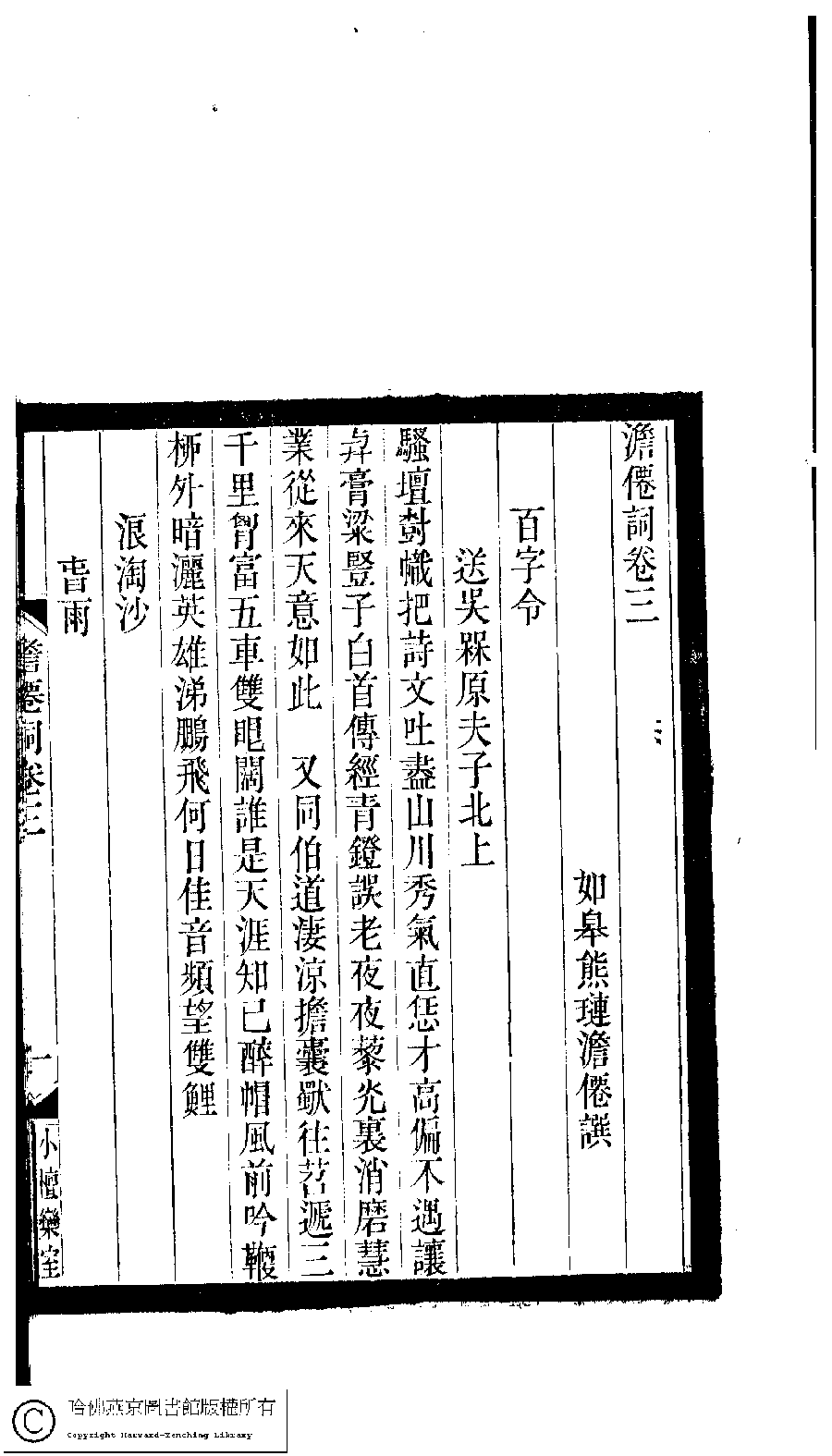| (PRINT FRIENDLY VERSION) 小檀欒室彙刻閨秀詞﹕十集一百種一百卷(清徐乃昌輯) : 澹僊詞﹕四卷。清光緒二十二年(1896)南陵徐氏刻本。 ![]() Page : 澹僊詞.卷3.1b | click for larger image | 小檀欒室彙刻閨秀詞﹕十集一百種一百卷(清徐乃昌輯) : 澹僊詞﹕四卷。清光緒二十二年(1896)南陵徐氏刻本。![]() Page : 澹僊詞.卷3.1a | click for larger image | Back |