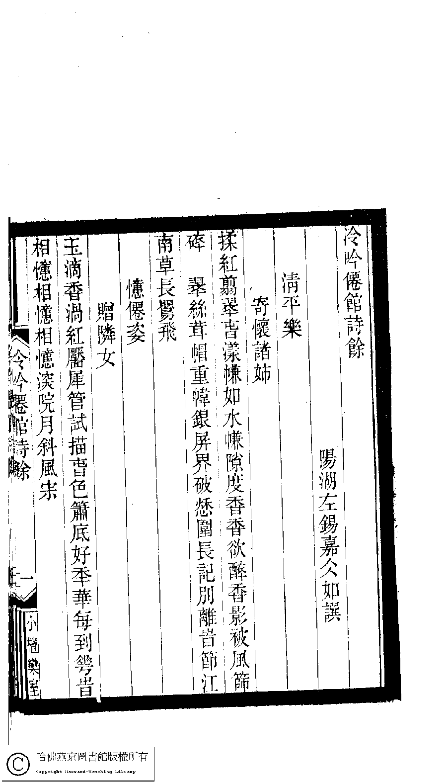| Appears in: Xiao tan luan shi hui ke gui xiu ci: 10 ji 100 zhong 100 juan (edited by Xu Naichang, Qing dynasty): Leng yin xian guan shi yu: 1 juan |