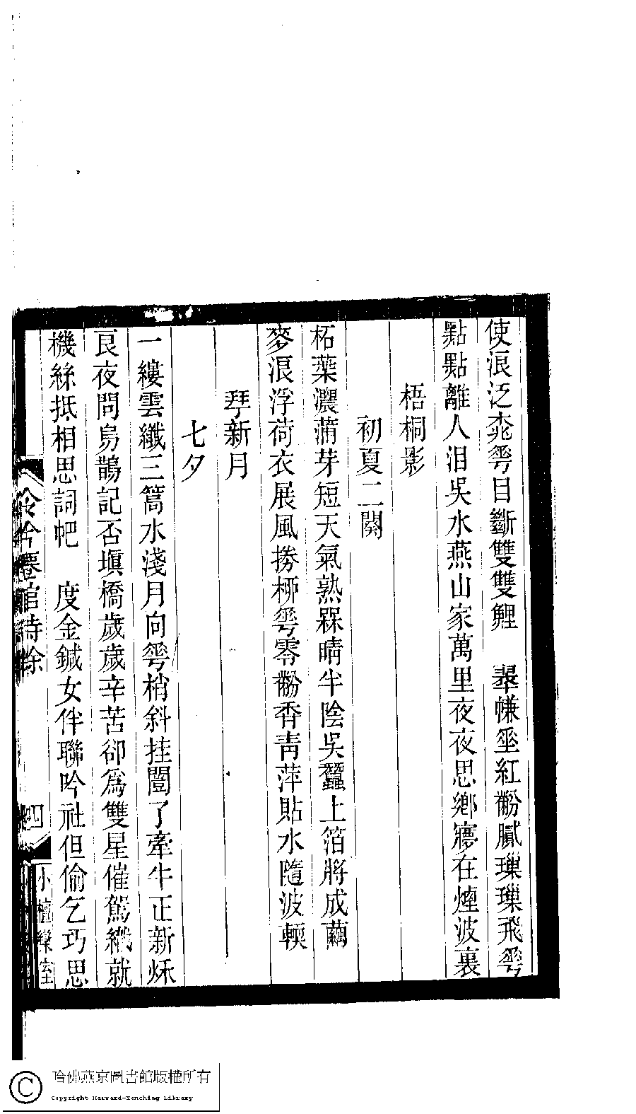 | (PRINT FRIENDLY VERSION) 小檀欒室彙刻閨秀詞﹕十集一百種一百卷(清徐乃昌輯) : 冷吟仙館詩餘﹕一卷。清光緒二十二年(1896)南陵徐氏刻本。 ![]() Page : 冷吟仙館詩餘.4a | click for larger image | 小檀欒室彙刻閨秀詞﹕十集一百種一百卷(清徐乃昌輯) : 冷吟仙館詩餘﹕一卷。清光緒二十二年(1896)南陵徐氏刻本。![]() Page : 冷吟仙館詩餘.3b | click for larger image | Back |