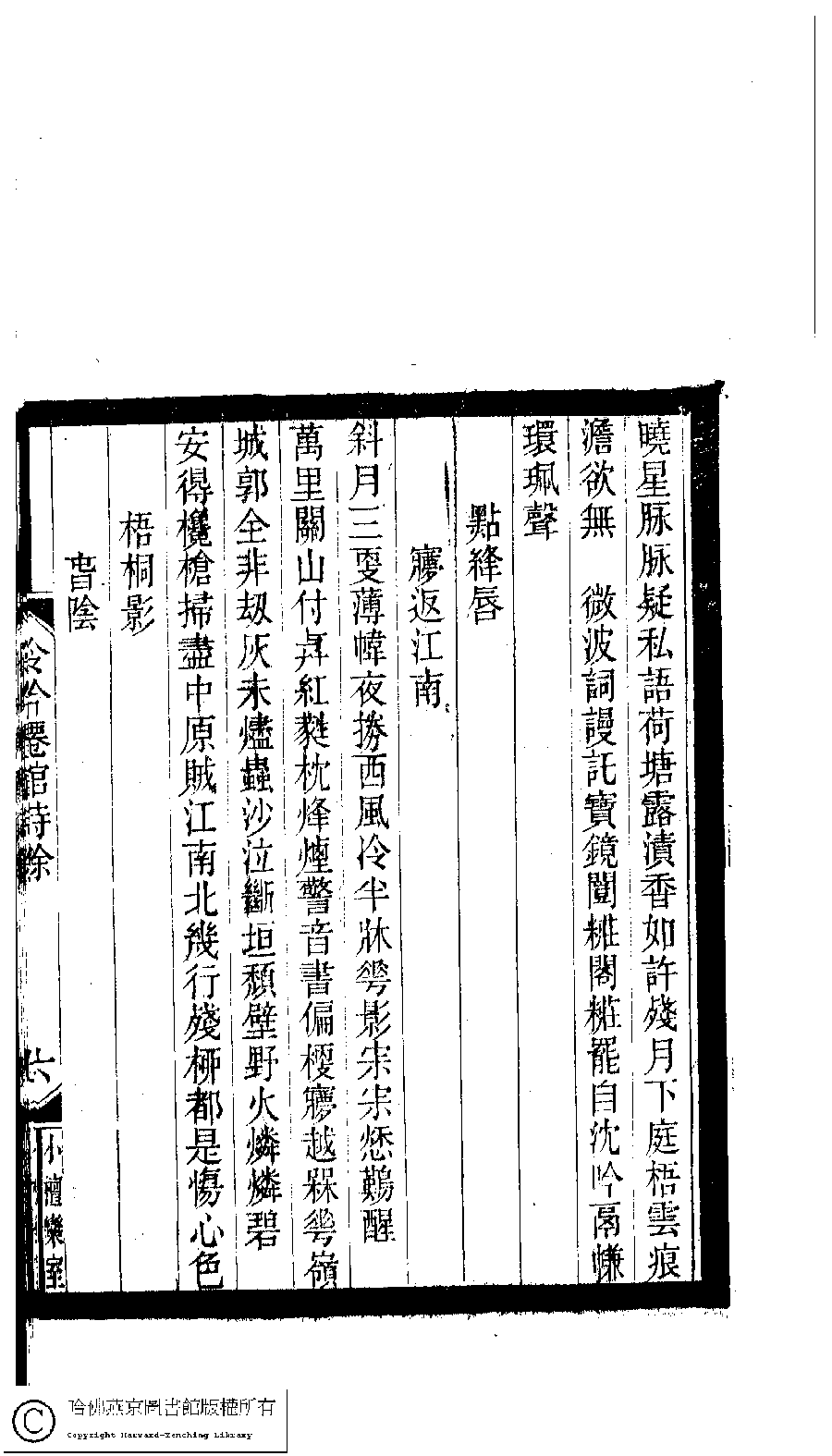 | Appears in: Xiao tan luan shi hui ke gui xiu ci: 10 ji 100 zhong 100 juan (edited by Xu Naichang, Qing dynasty): Leng yin xian guan shi yu: 1 juan |