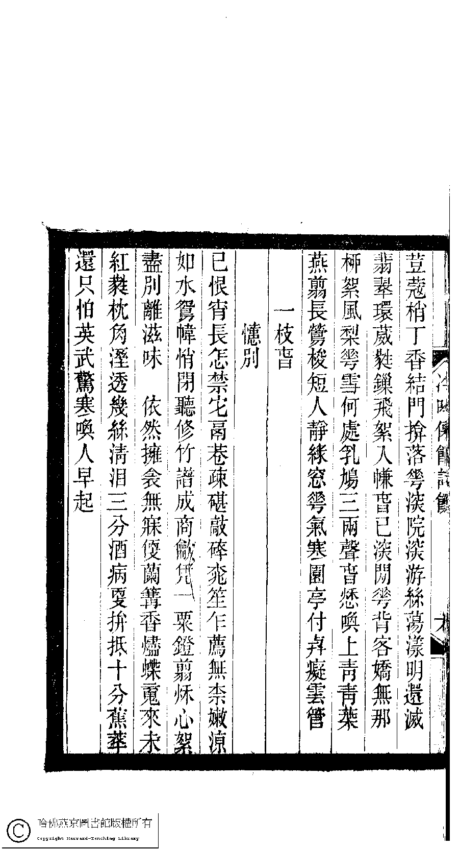 | (PRINT FRIENDLY VERSION) 小檀欒室彙刻閨秀詞﹕十集一百種一百卷(清徐乃昌輯) : 冷吟仙館詩餘﹕一卷。清光緒二十二年(1896)南陵徐氏刻本。 ![]() Page : 冷吟仙館詩餘.6b | click for larger image | 小檀欒室彙刻閨秀詞﹕十集一百種一百卷(清徐乃昌輯) : 冷吟仙館詩餘﹕一卷。清光緒二十二年(1896)南陵徐氏刻本。![]() Page : 冷吟仙館詩餘.6a | click for larger image | Back |