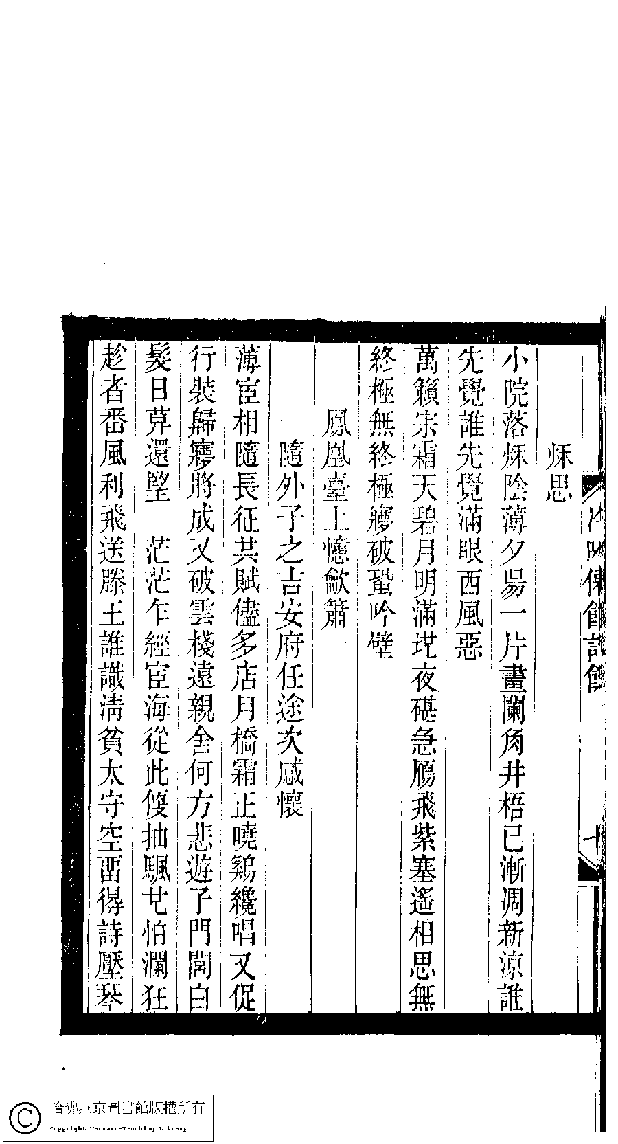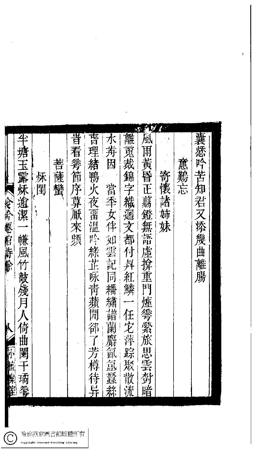 | (PRINT FRIENDLY VERSION) 小檀欒室彙刻閨秀詞﹕十集一百種一百卷(清徐乃昌輯) : 冷吟仙館詩餘﹕一卷。清光緒二十二年(1896)南陵徐氏刻本。 ![]() Page : 冷吟仙館詩餘.8a | click for larger image | 小檀欒室彙刻閨秀詞﹕十集一百種一百卷(清徐乃昌輯) : 冷吟仙館詩餘﹕一卷。清光緒二十二年(1896)南陵徐氏刻本。![]() Page : 冷吟仙館詩餘.7b | click for larger image | Back |