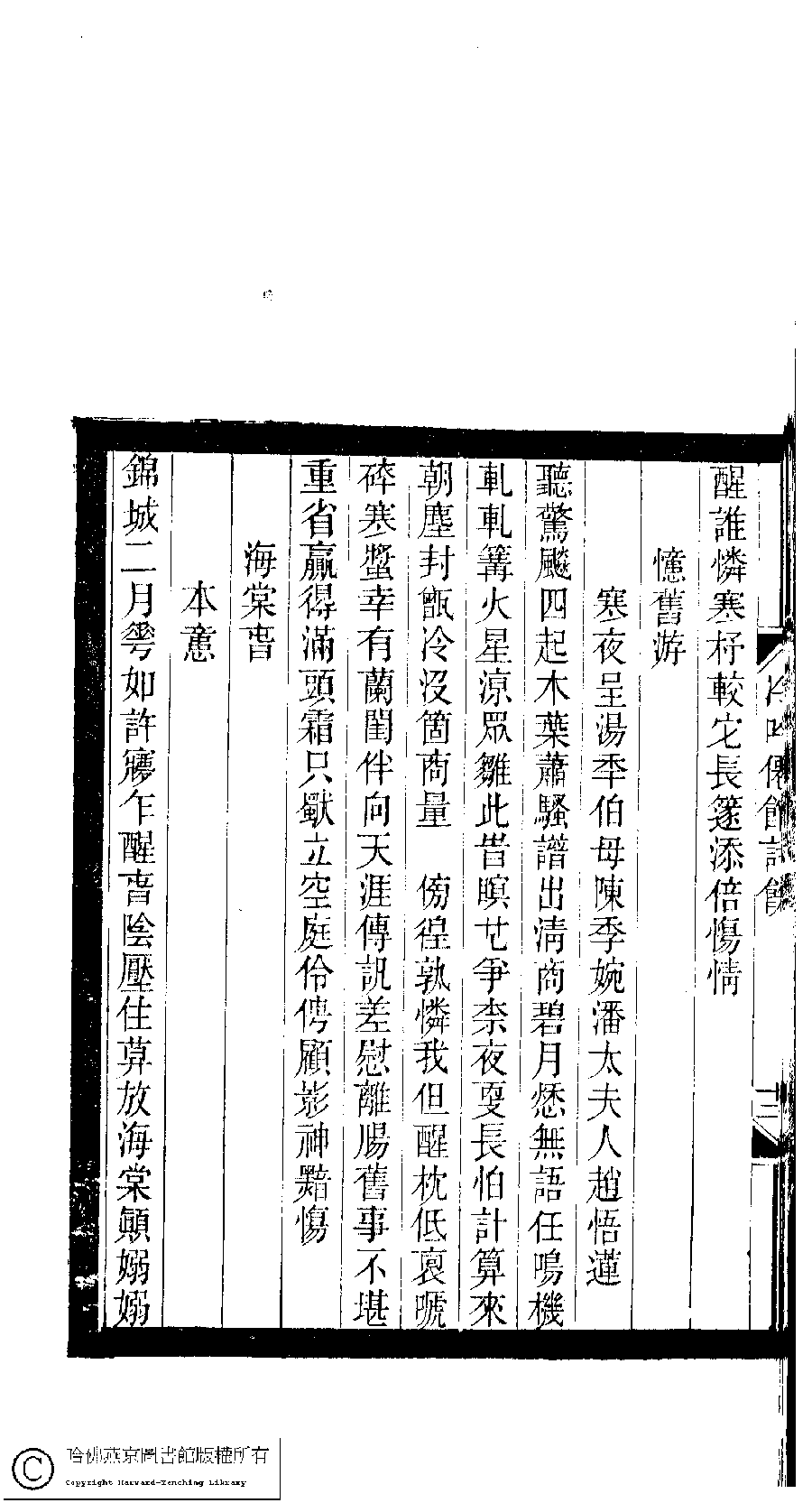 | Appears in: Xiao tan luan shi hui ke gui xiu ci: 10 ji 100 zhong 100 juan (edited by Xu Naichang, Qing dynasty): Leng yin xian guan shi yu: 1 juan |