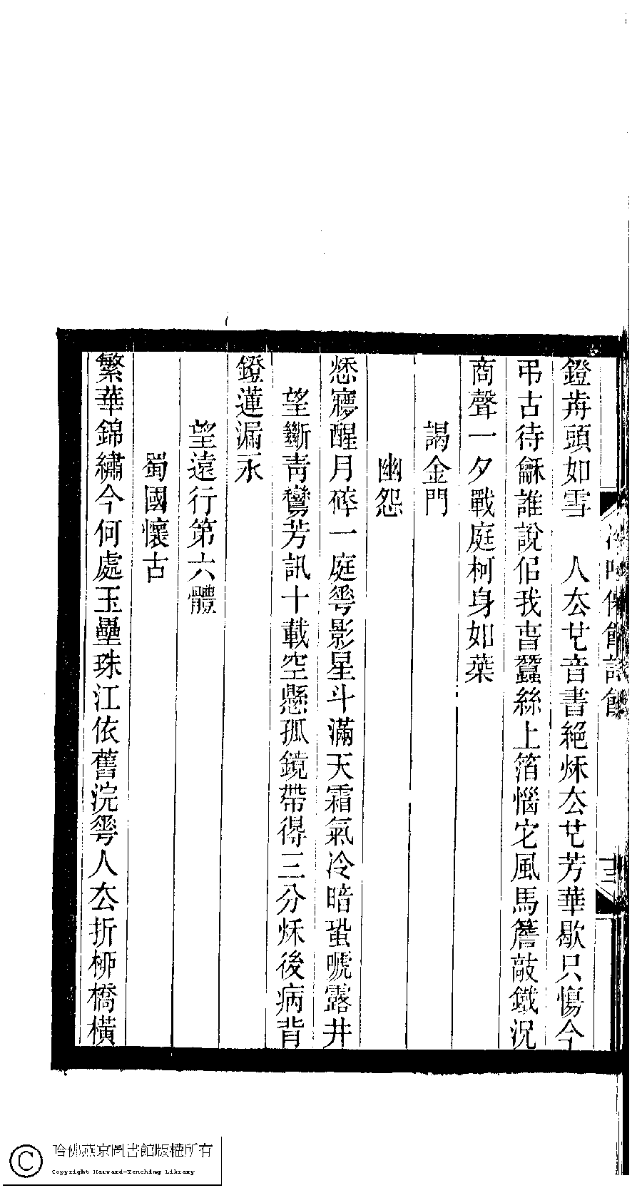 | Appears in: Xiao tan luan shi hui ke gui xiu ci: 10 ji 100 zhong 100 juan (edited by Xu Naichang, Qing dynasty): Leng yin xian guan shi yu: 1 juan |