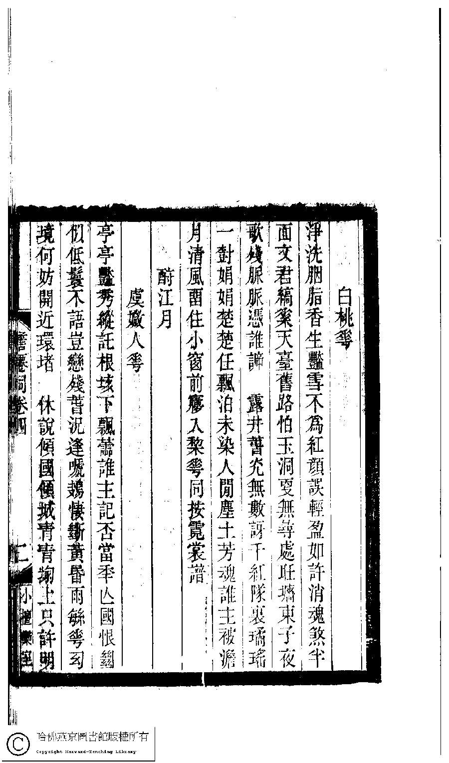 | (PRINT FRIENDLY VERSION) 小檀欒室彙刻閨秀詞﹕十集一百種一百卷(清徐乃昌輯) : 澹僊詞﹕四卷。清光緒二十二年(1896)南陵徐氏刻本。 ![]() Page : 澹僊詞.卷4.2b | click for larger image | 小檀欒室彙刻閨秀詞﹕十集一百種一百卷(清徐乃昌輯) : 澹僊詞﹕四卷。清光緒二十二年(1896)南陵徐氏刻本。![]() Page : 澹僊詞.卷4.2a | click for larger image | Back |