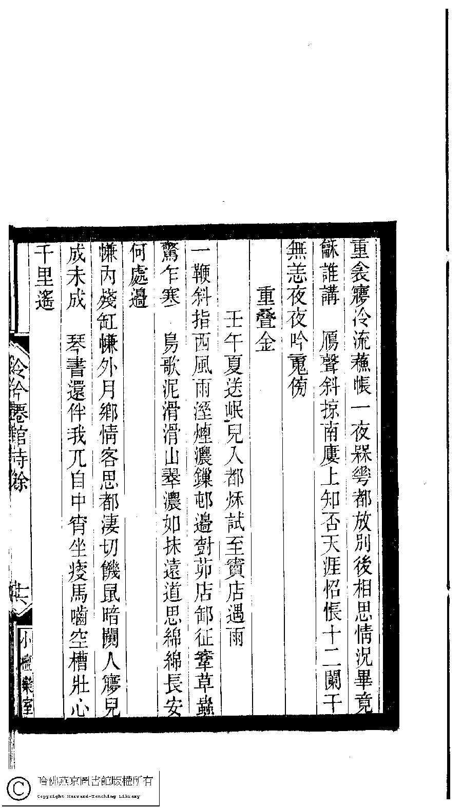 | (PRINT FRIENDLY VERSION) 小檀欒室彙刻閨秀詞﹕十集一百種一百卷(清徐乃昌輯) : 冷吟仙館詩餘﹕一卷。清光緒二十二年(1896)南陵徐氏刻本。 ![]() Page : 冷吟仙館詩餘.16a | click for larger image | 小檀欒室彙刻閨秀詞﹕十集一百種一百卷(清徐乃昌輯) : 冷吟仙館詩餘﹕一卷。清光緒二十二年(1896)南陵徐氏刻本。![]() Page : 冷吟仙館詩餘.15b | click for larger image | Back |