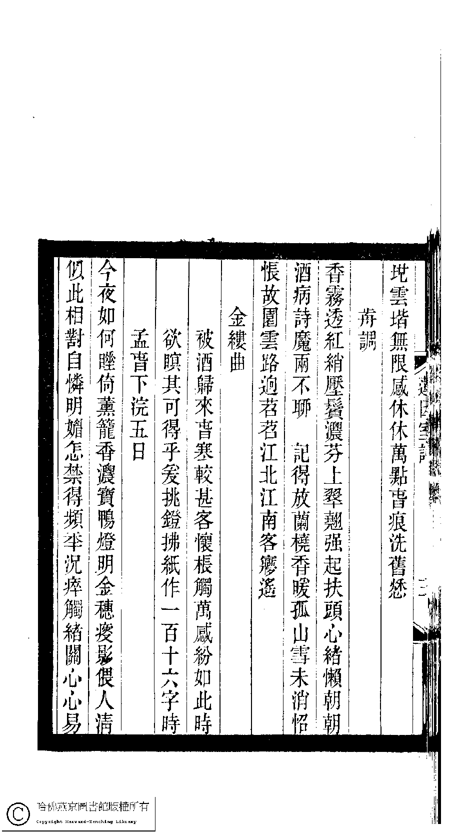 | Appears in: Xiao tan luan shi hui ke gui xiu ci: 10 ji 100 zhong 100 juan (edited by Xu Naichang, Qing dynasty): Lian yin shi ci: 1 juan |
