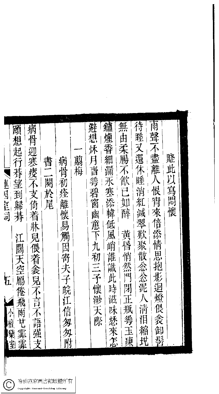 | (PRINT FRIENDLY VERSION) 小檀欒室彙刻閨秀詞﹕十集一百種一百卷(清徐乃昌輯) : 蓮因室詞﹕一卷。清光緒二十二年(1896)南陵徐氏刻本。 ![]() Page : 蓮因室詞.5a | click for larger image | 小檀欒室彙刻閨秀詞﹕十集一百種一百卷(清徐乃昌輯) : 蓮因室詞﹕一卷。清光緒二十二年(1896)南陵徐氏刻本。![]() Page : 蓮因室詞.4b | click for larger image | Back |