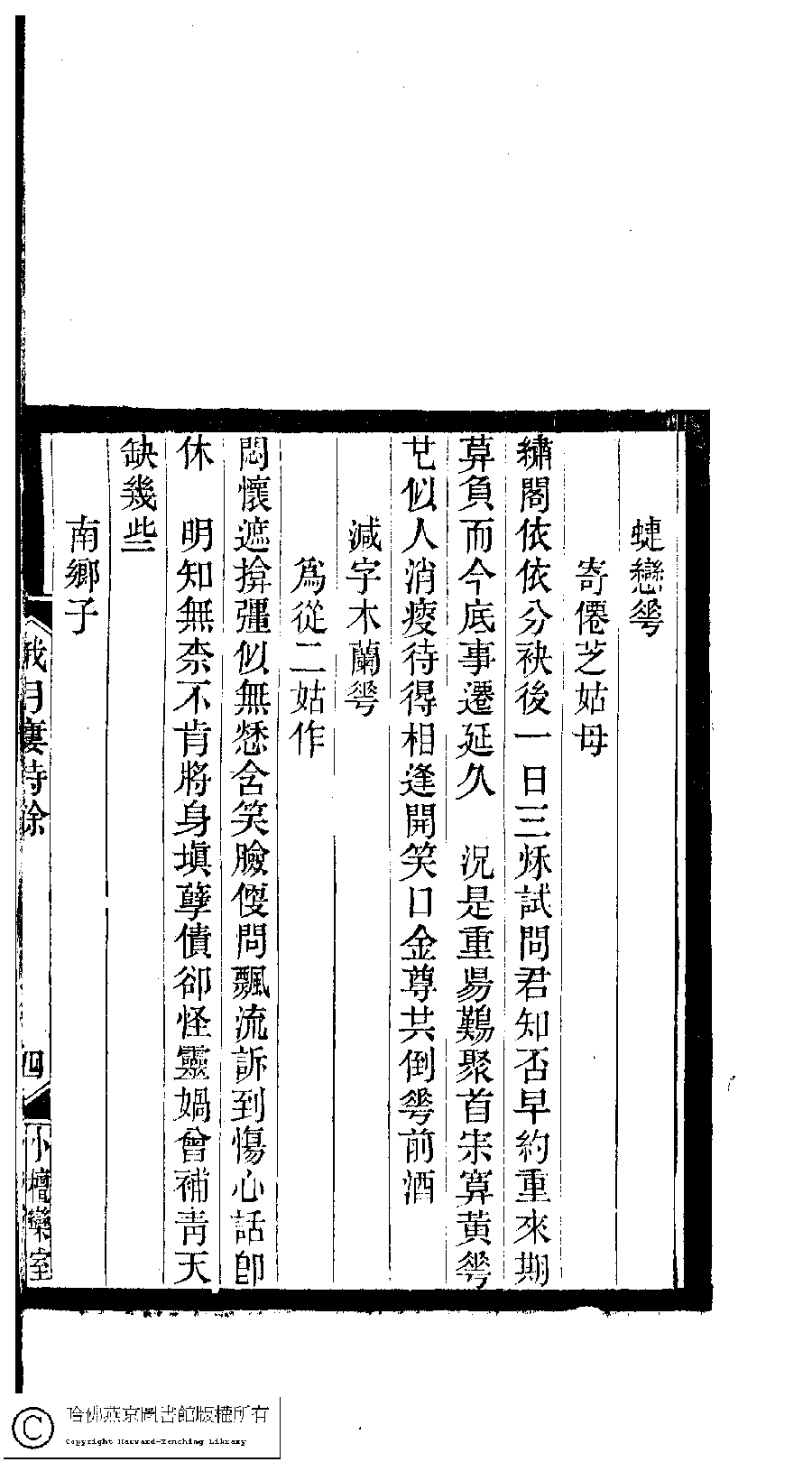 | (PRINT FRIENDLY VERSION) 小檀欒室彙刻閨秀詞﹕十集一百種一百卷(清徐乃昌輯) : 哦月樓詩餘﹕一卷。清光緒二十二年(1896)南陵徐氏刻本。 ![]() Page : 哦月樓詩餘.4a | click for larger image | Back |