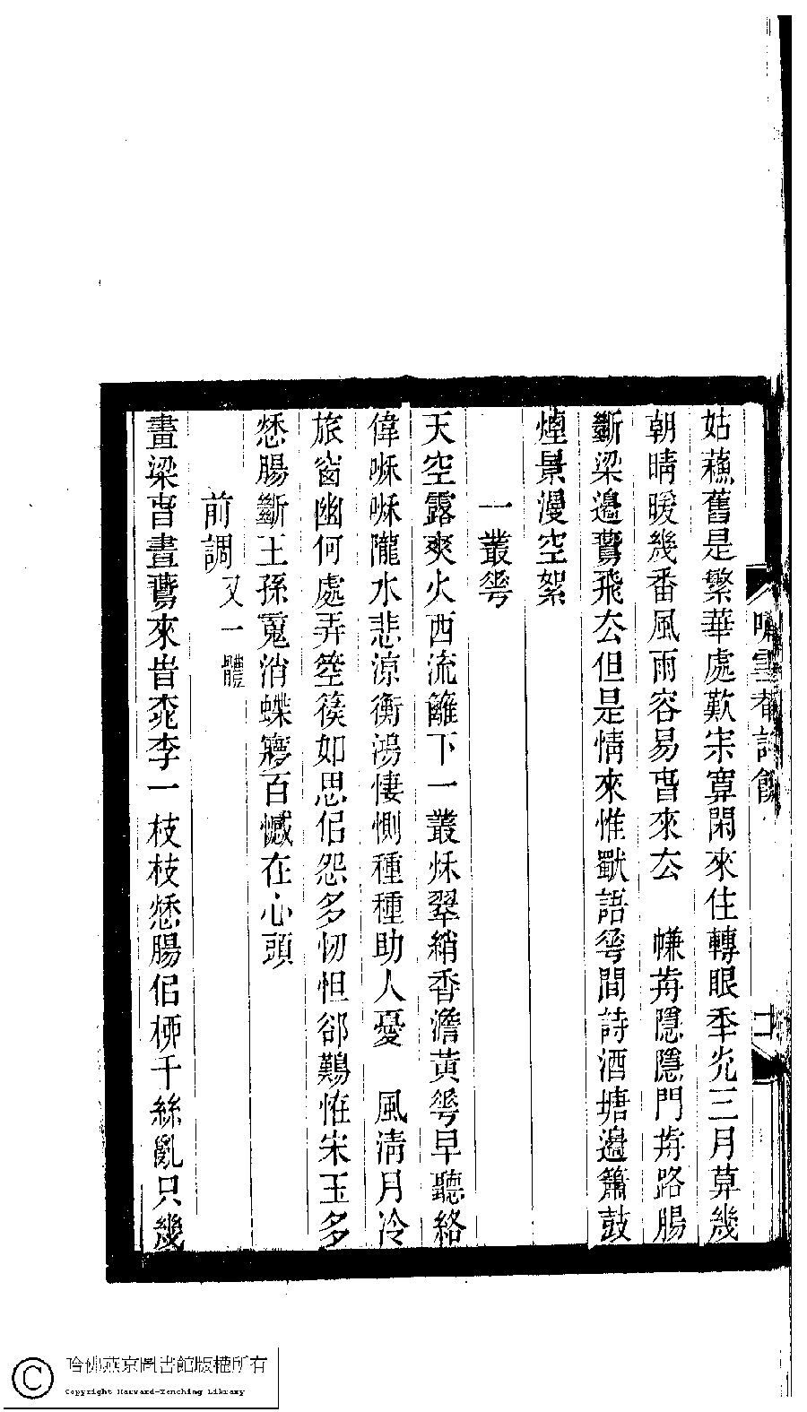 | (PRINT FRIENDLY VERSION) 小檀欒室彙刻閨秀詞﹕十集一百種一百卷(清徐乃昌輯) : 嘯雪庵詩餘﹕一卷。清光緒二十二年(1896)南陵徐氏刻本。 ![]() Page : 嘯雪庵詩餘.11b | click for larger image | 小檀欒室彙刻閨秀詞﹕十集一百種一百卷(清徐乃昌輯) : 嘯雪庵詩餘﹕一卷。清光緒二十二年(1896)南陵徐氏刻本。![]() Page : 嘯雪庵詩餘.11a | click for larger image | Back |