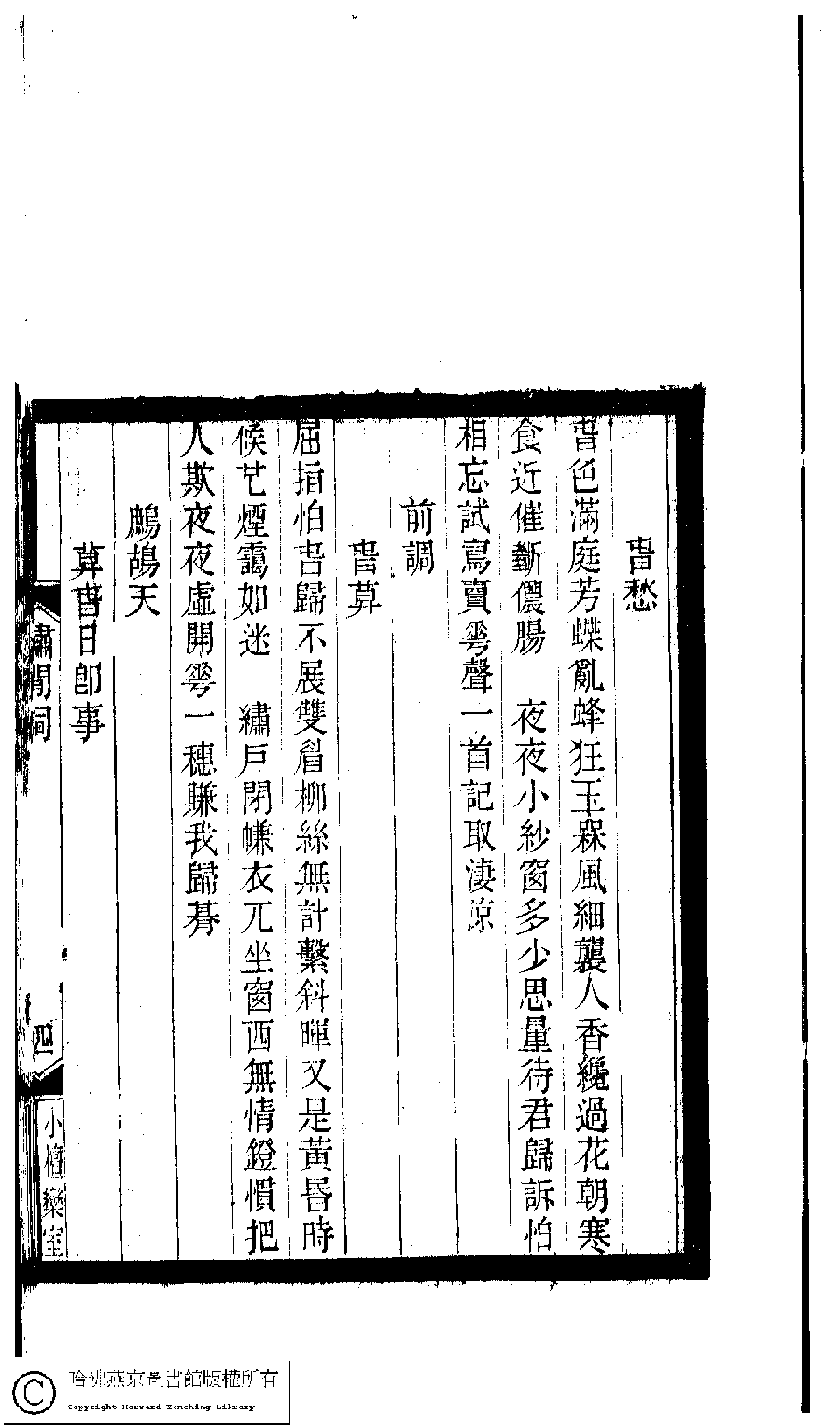 | (PRINT FRIENDLY VERSION) 小檀欒室彙刻閨秀詞﹕十集一百種一百卷(清徐乃昌輯) : 繡閒詞﹕一卷。清光緒二十二年(1896)南陵徐氏刻本。 ![]() Page : 繡閒詞.4a | click for larger image | Back |