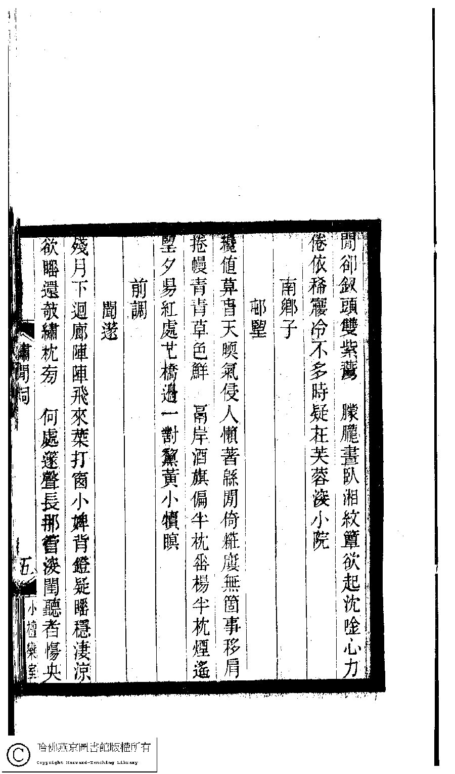| (PRINT FRIENDLY VERSION) 小檀欒室彙刻閨秀詞﹕十集一百種一百卷(清徐乃昌輯) : 繡閒詞﹕一卷。清光緒二十二年(1896)南陵徐氏刻本。 ![]() Page : 繡閒詞.5a | click for larger image | Back |