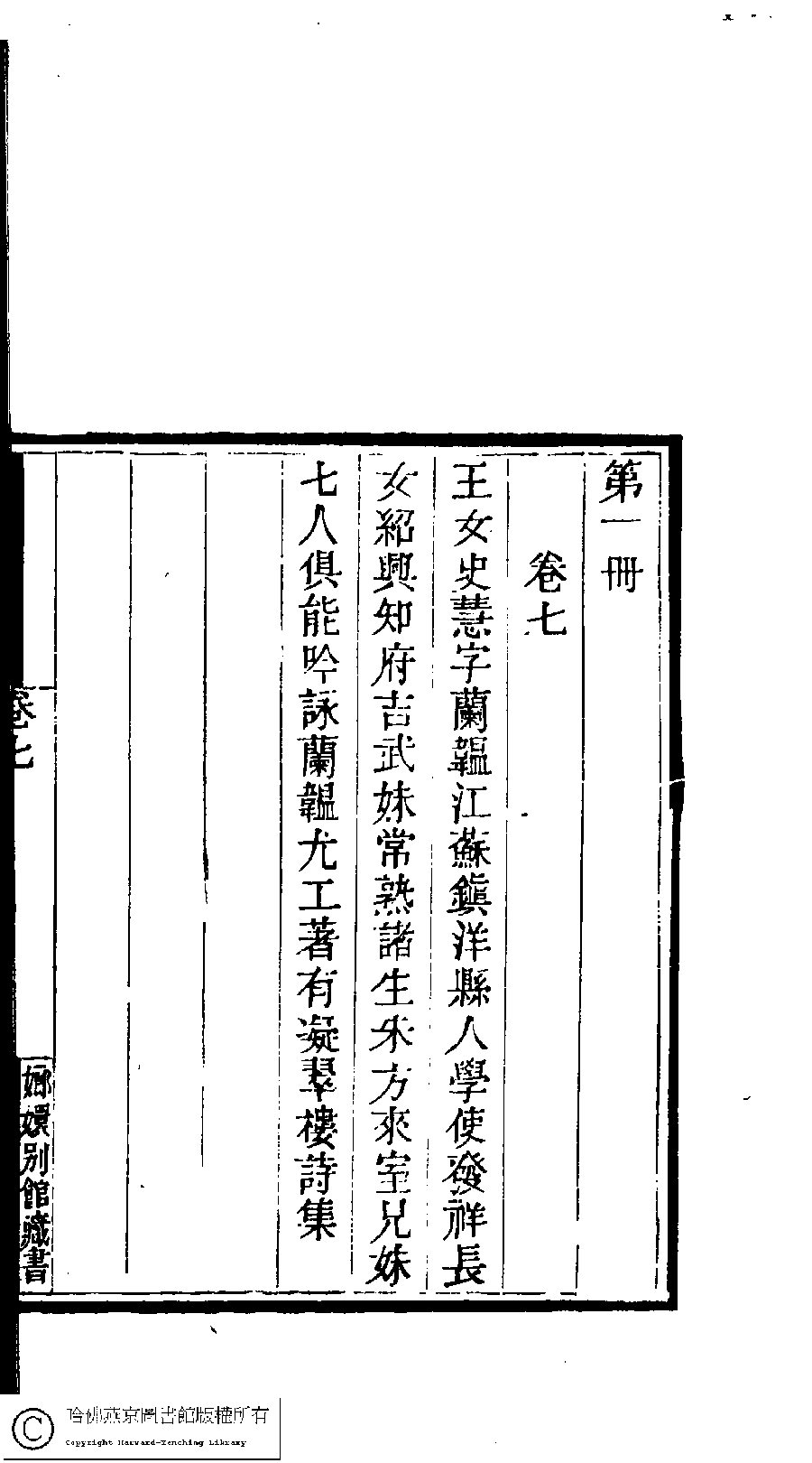 | (PRINT FRIENDLY VERSION) 國朝閨閣詩鈔﹕一百種一百卷(清蔡殿齊輯) : 凝翠樓詩集﹕一卷。清道光二十四年(1844)刻本。 ![]() Page : 1.31b | click for larger image | 國朝閨閣詩鈔﹕一百種一百卷(清蔡殿齊輯) : 凝翠樓詩集﹕一卷。清道光二十四年(1844)刻本。![]() Page : 1.31a | click for larger image | Back |