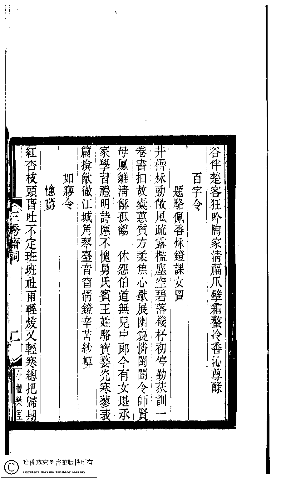 | (PRINT FRIENDLY VERSION) 小檀欒室彙刻閨秀詞﹕十集一百種一百卷(清徐乃昌輯) : 三秀齋詞﹕一卷。清光緒二十二年(1896)南陵徐氏刻本。 ![]() Page : 三秀齋詞.2b | click for larger image | 小檀欒室彙刻閨秀詞﹕十集一百種一百卷(清徐乃昌輯) : 三秀齋詞﹕一卷。清光緒二十二年(1896)南陵徐氏刻本。![]() Page : 三秀齋詞.2a | click for larger image | Back |