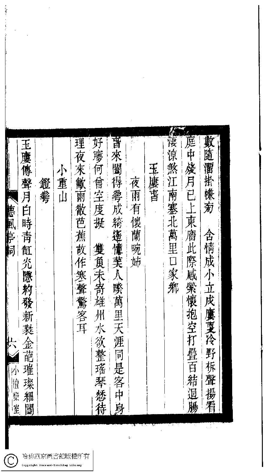 | Appears in: Xiao tan luan shi hui ke gui xiu ci: 10 ji 100 zhong 100 juan (edited by Xu Naichang, Qing dynasty): De feng ting ci: 1 juan |