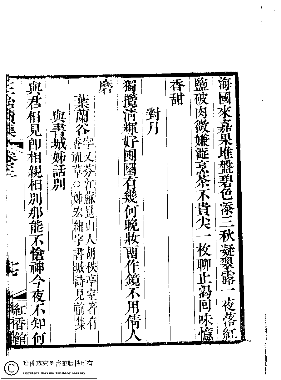 | (PRINT FRIENDLY VERSION) 國朝閨秀正始續集﹕十卷﹐附錄﹕一卷﹐補遺﹕一卷﹐輓詞﹕一卷(清惲珠輯)。清道光十六年(1836)紅香館刻本。 ![]() Page : 3.17b | click for larger image | 國朝閨秀正始續集﹕十卷﹐附錄﹕一卷﹐補遺﹕一卷﹐輓詞﹕一卷(清惲珠輯)。清道光十六年(1836)紅香館刻本。![]() Page : 3.17a | click for larger image | Back |