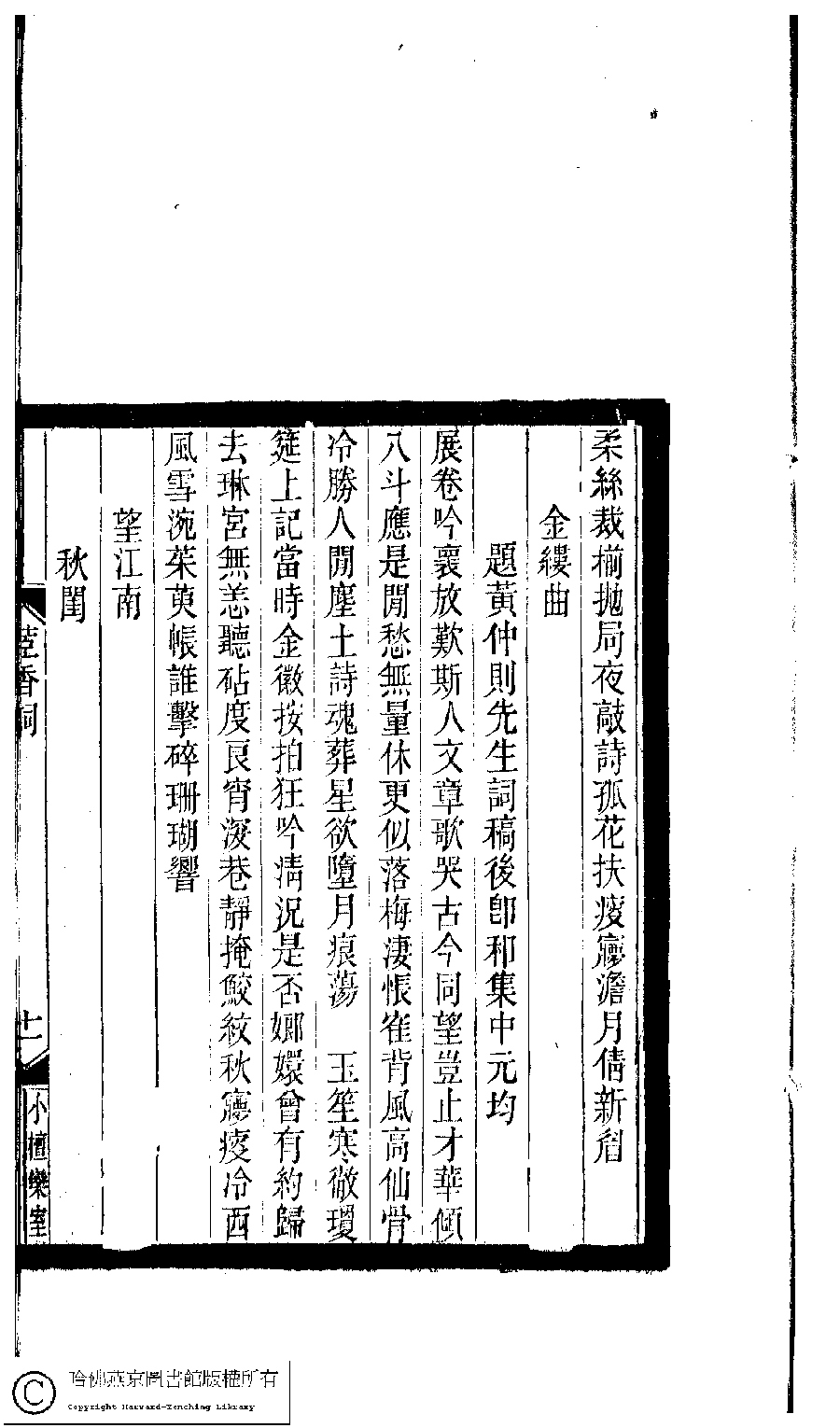 | (PRINT FRIENDLY VERSION) 小檀欒室彙刻閨秀詞﹕十集一百種一百卷(清徐乃昌輯) : 茝香詞﹕一卷。清光緒二十二年(1896)南陵徐氏刻本。 ![]() Page : 茞香詞.11a | click for larger image | 小檀欒室彙刻閨秀詞﹕十集一百種一百卷(清徐乃昌輯) : 茝香詞﹕一卷。清光緒二十二年(1896)南陵徐氏刻本。![]() Page : 茞香詞.10b | click for larger image | Back |