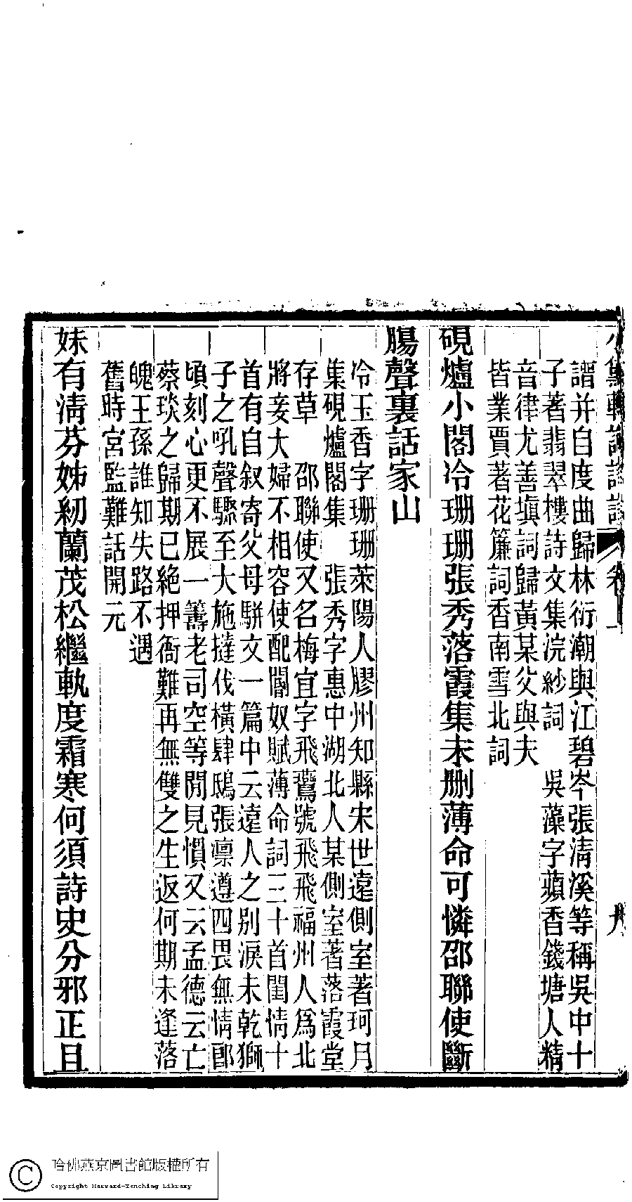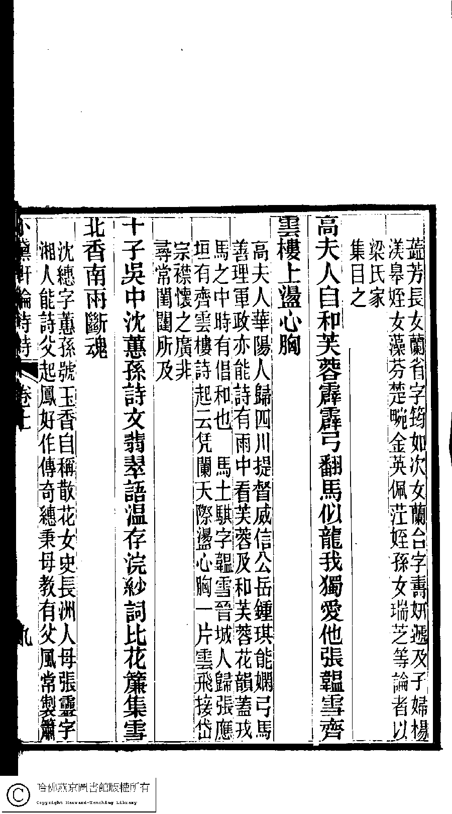 | (PRINT FRIENDLY VERSION) 陳孝女遺集﹕二卷﹔小黛軒論詩詩﹕二卷(清陳芸撰)。民國三年(1914)刻本 ![]() Page : 上.9b | click for larger image | 陳孝女遺集﹕二卷﹔小黛軒論詩詩﹕二卷(清陳芸撰)。民國三年(1914)刻本![]() Page : 上.9a | click for larger image | Back |